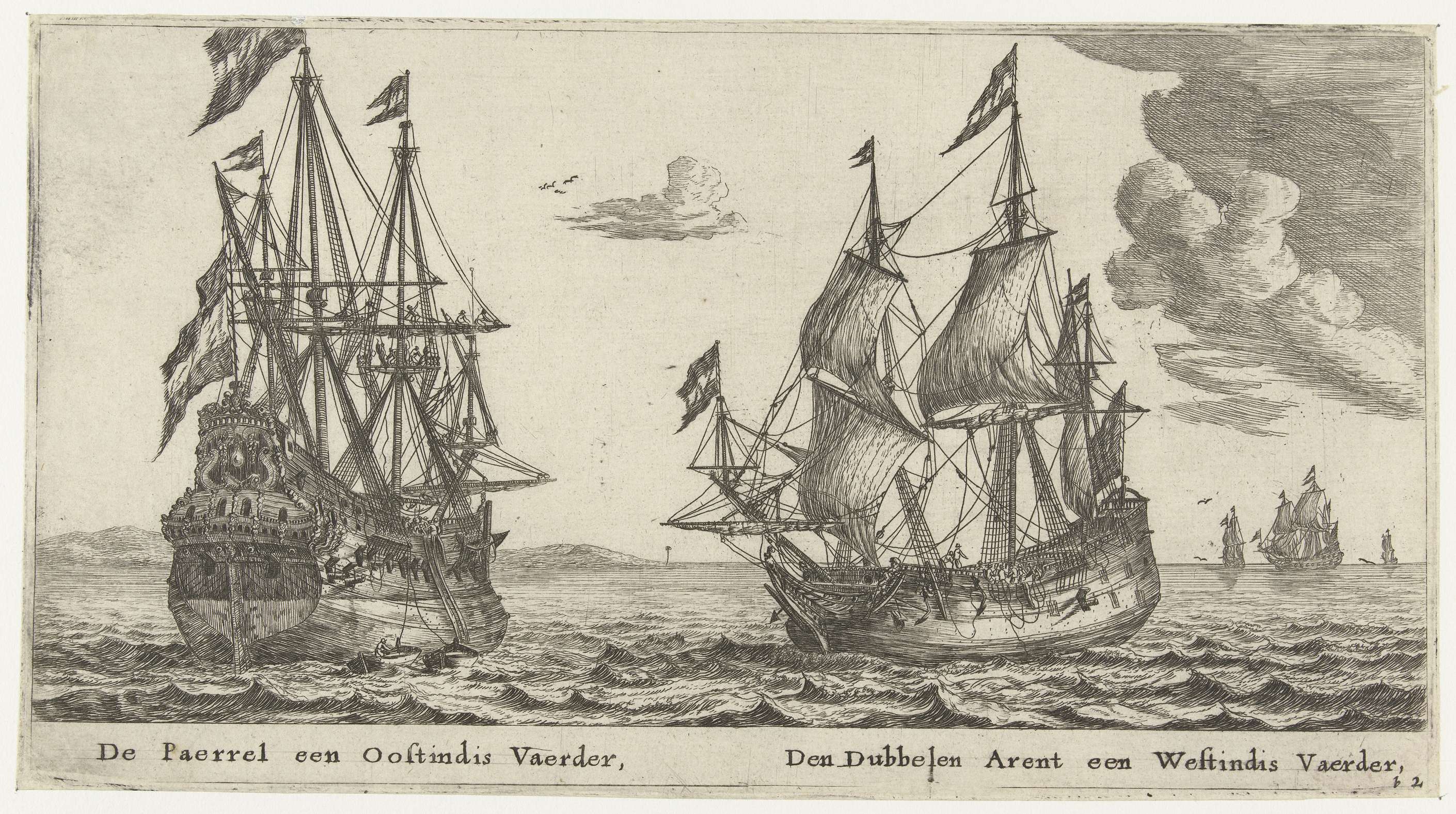 Twee koopvaardijschepen op zee vlak bij land. Links De Parel, een Oost-indiëvaarder en rechts De Dubbele Arend, een West-indiëvaarder.