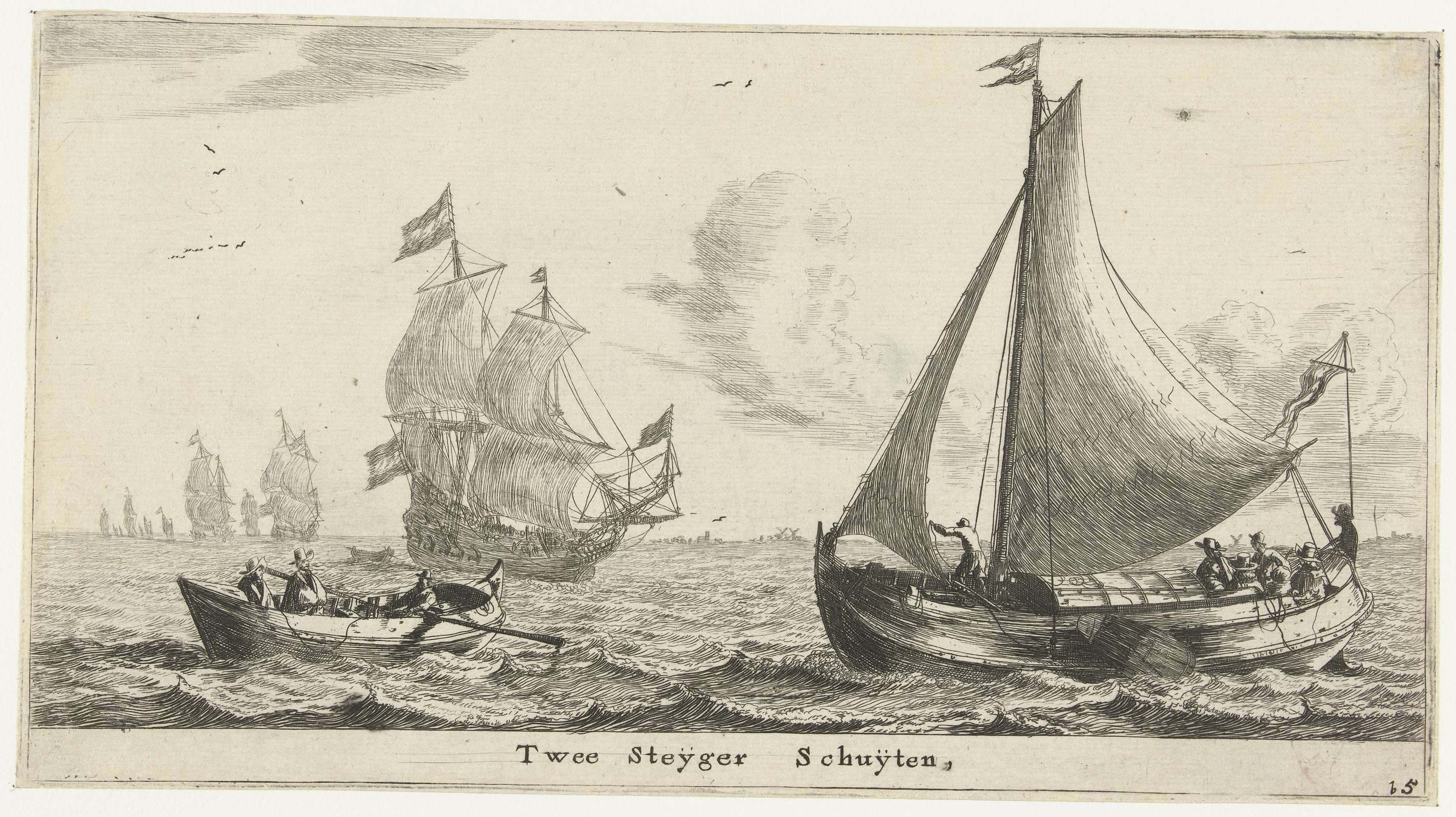 Een kleine roeiboot en een groter zeilschip, beide steigerschuiten of veerboten. Deze dienden om mensen over de binnenzee en inlandse meren te voeren.