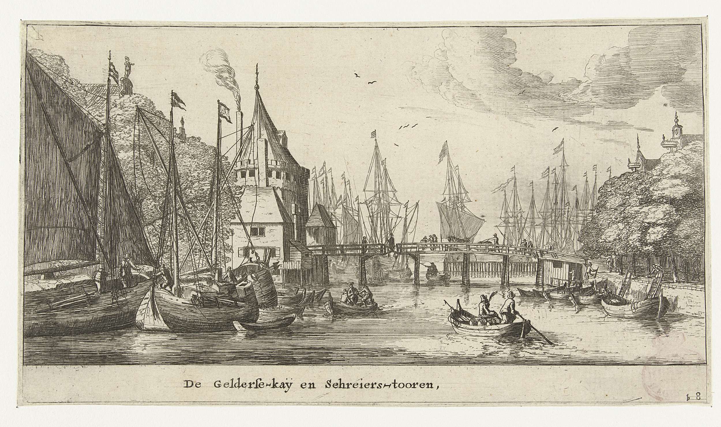 De Gelderse Kade, de Schreierstoren en de brug over het water. Vele schepen in het water.