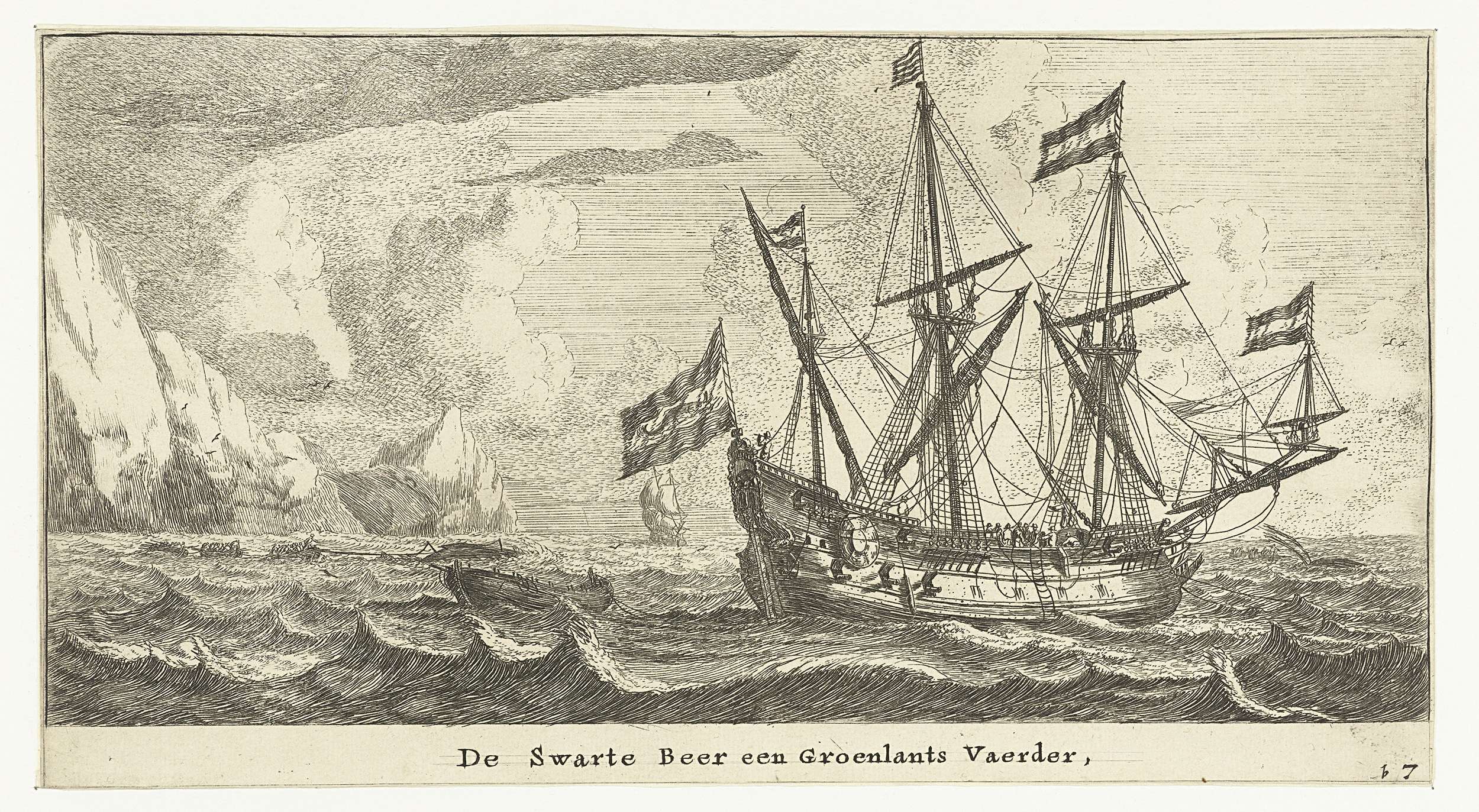 De Zwarte Beer, een koopvaardijschip varend op Groenland en een aantal roeiboten met mensen erin, jagend op walvissen. Op de achtergrond ijsbergen.