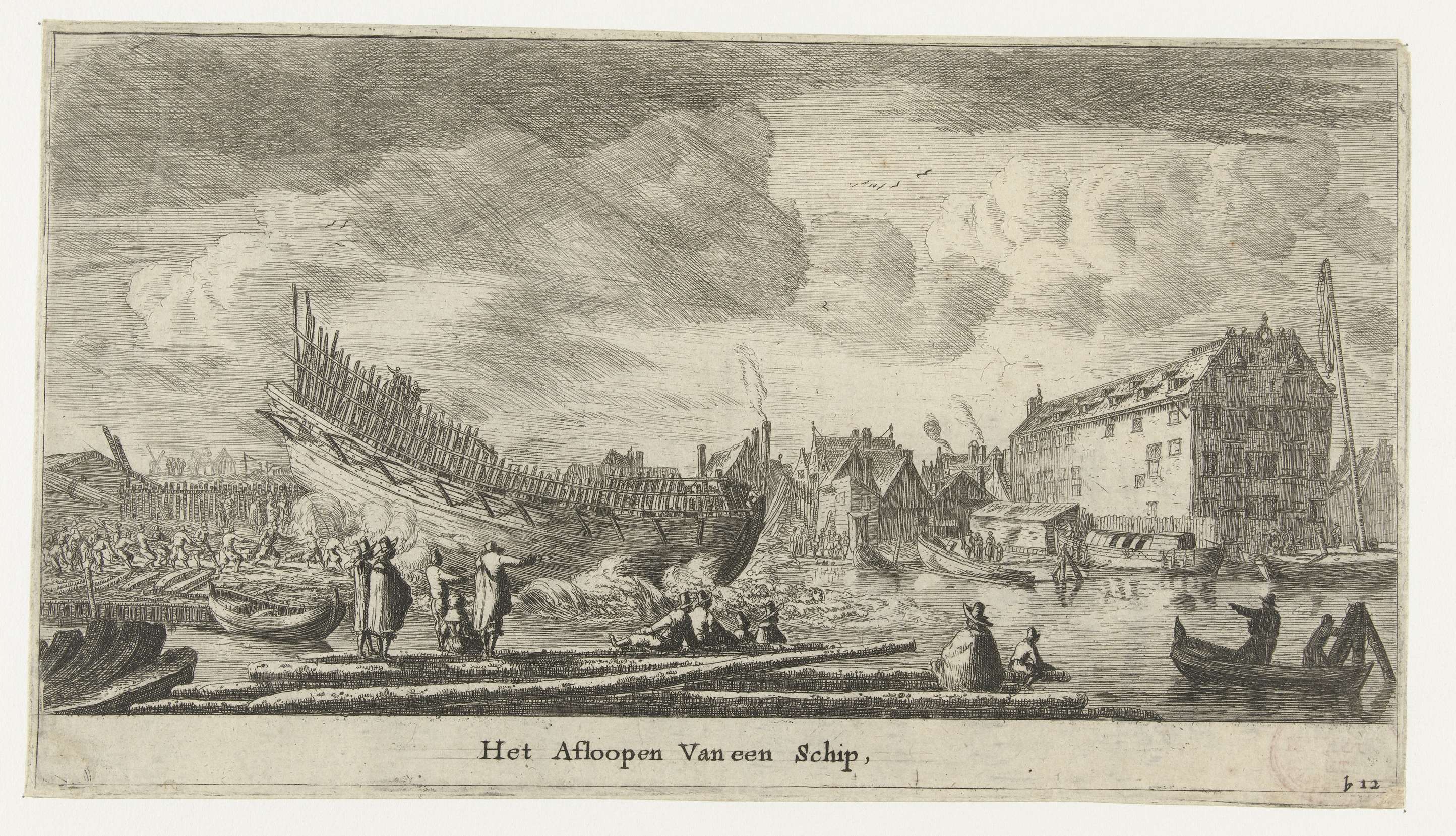 Scheepswerf van de Oostindië Compagnie (VOC) op de Rapenburg. Een tewaterlating van een groot schip waarvan de romp klaar is, maar de opbouw nog niet. Een aantal toeschouwers kijkt vanaf de kade toe.