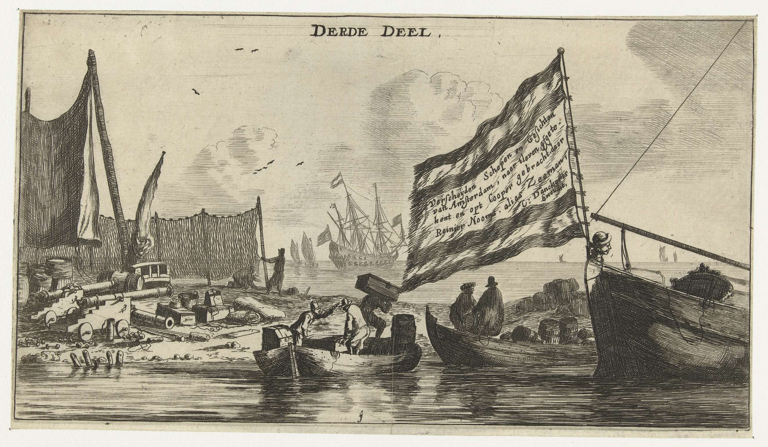 Titelblad van een serie van twaalf prenten. De zeehaven. Twee bootjes worden uitgeladen, op de wal liggen kanonnen, kogels en kruitvaten. In de verte op het water een aantal schepen.