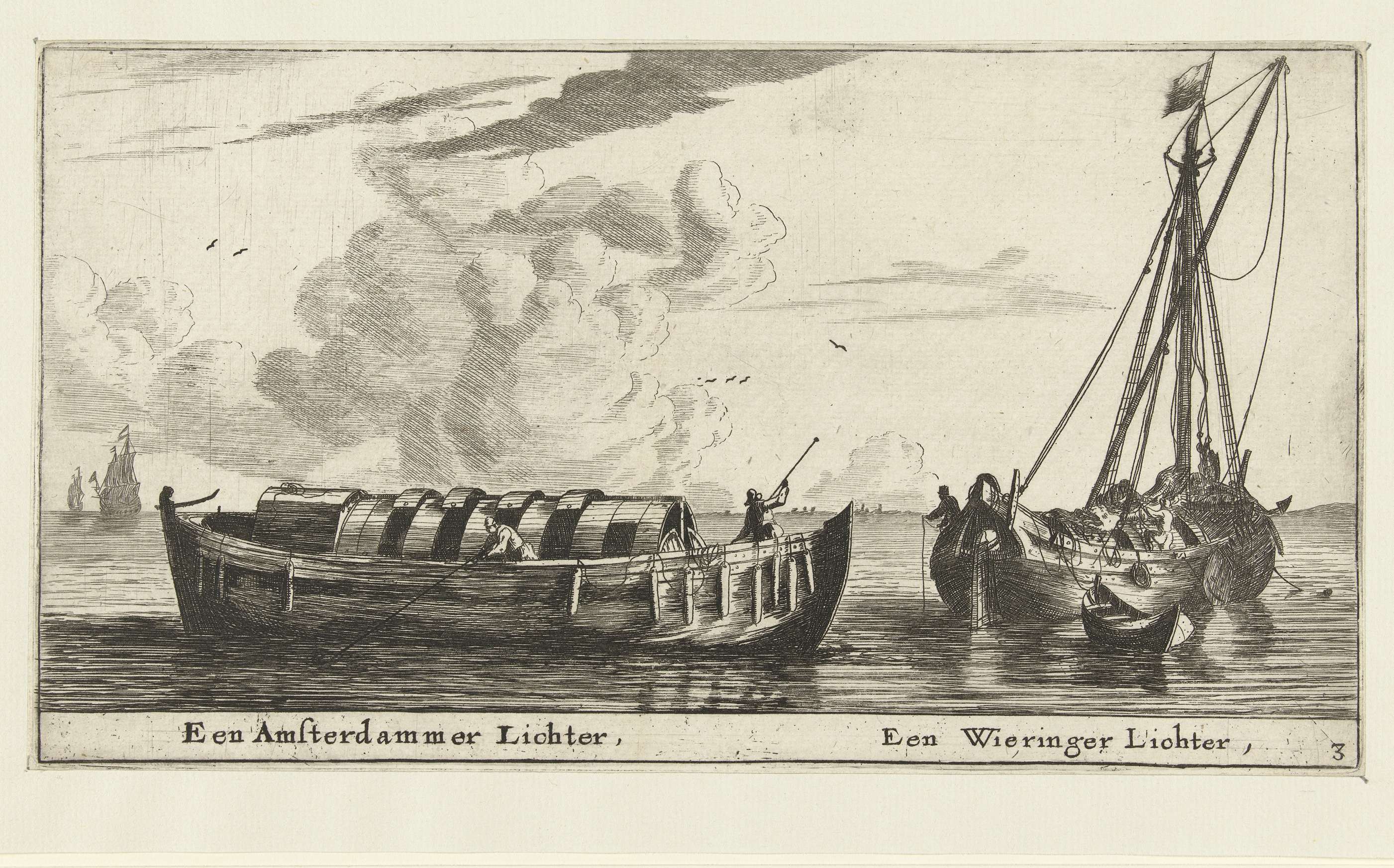 Een Amsterdammer lichter, een klein schip waar de goederen uit een groot schip in kunnen worden overgeladen, en een Wieringer lichter met masten.