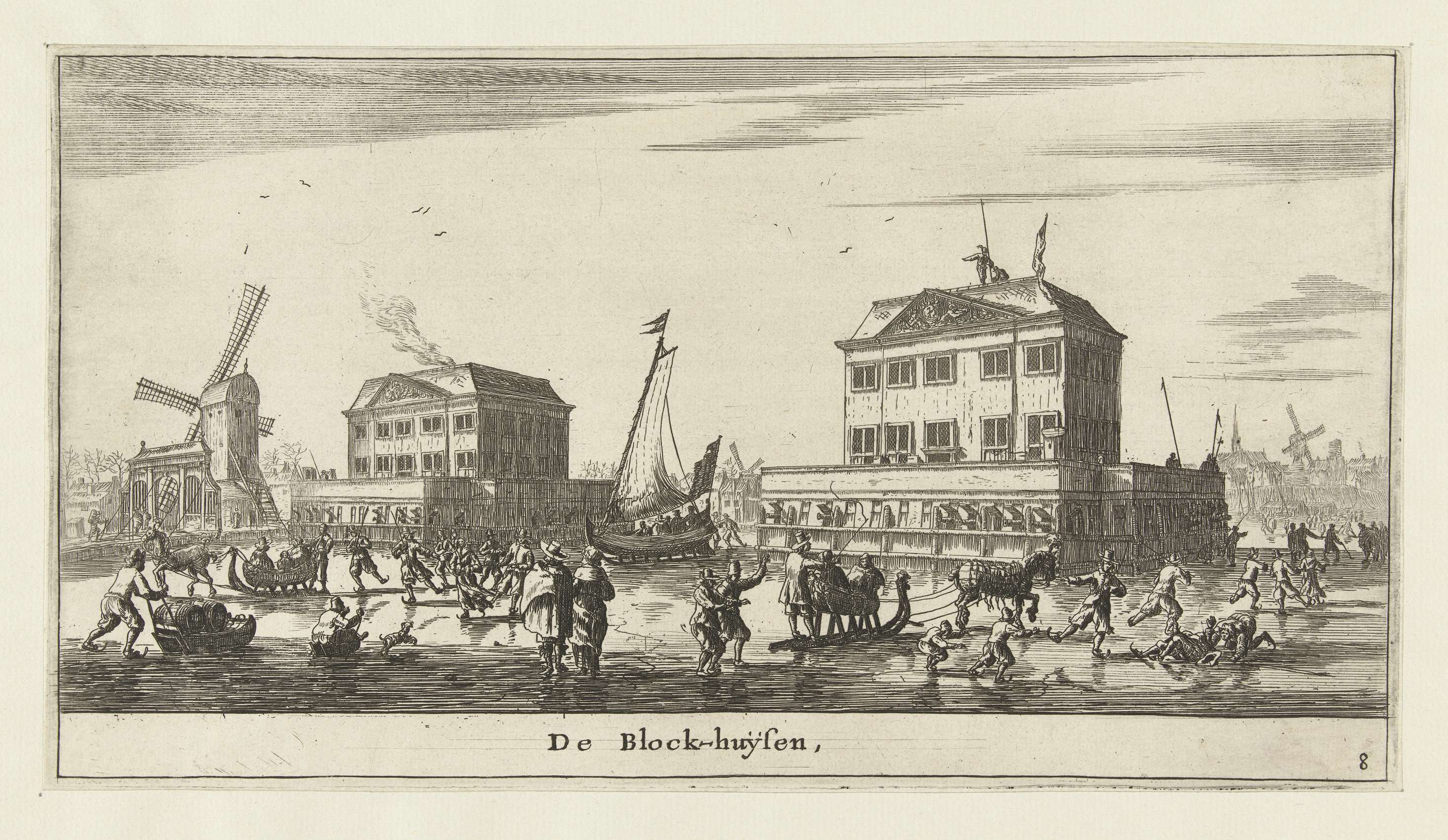 De twee blokhuizen bij de Amstel. Schaatsende en sleeënde mensen op het ijs van de Amstel.