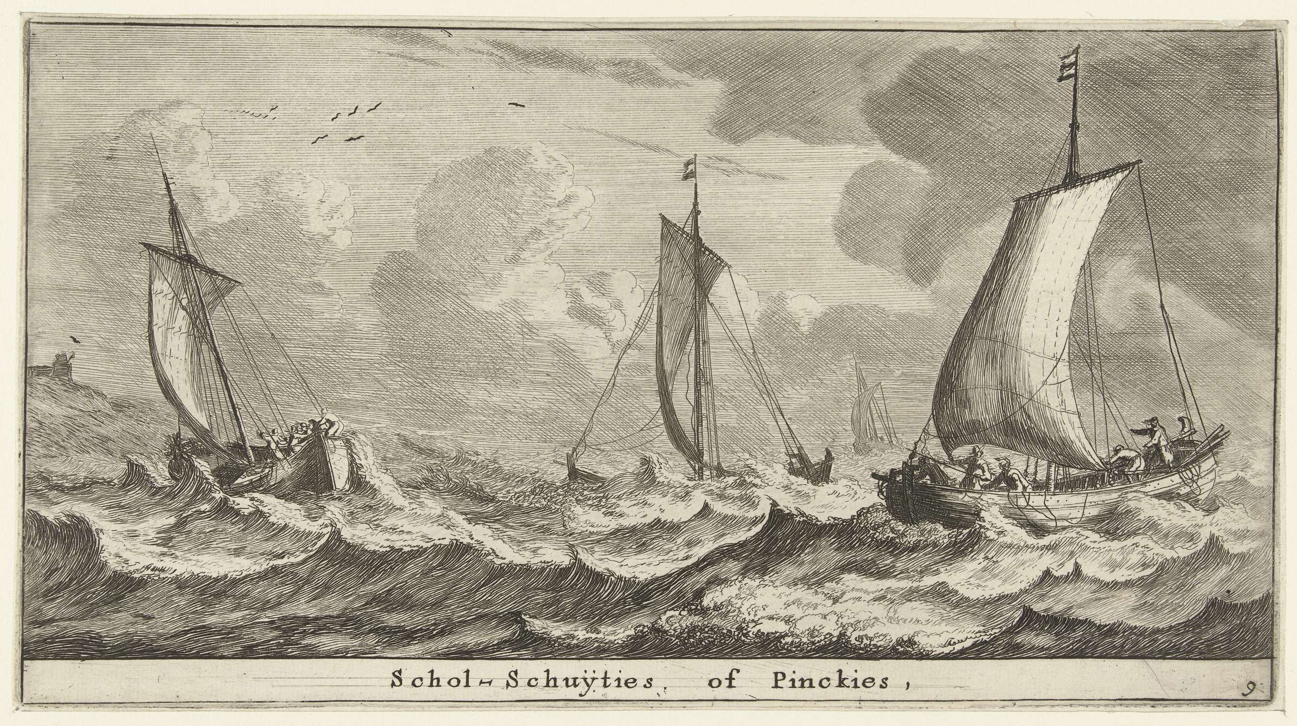 Onstuimige zee met drie scholschuiten op de voorgrond en een vierde aan de horizon. Links de kust.