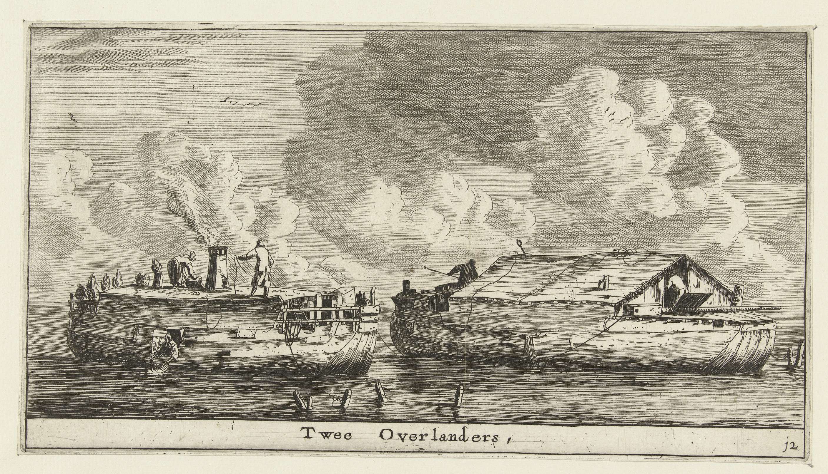 Mogelijk woonschepen. Op het rechterschip wordt de was gedaan.
