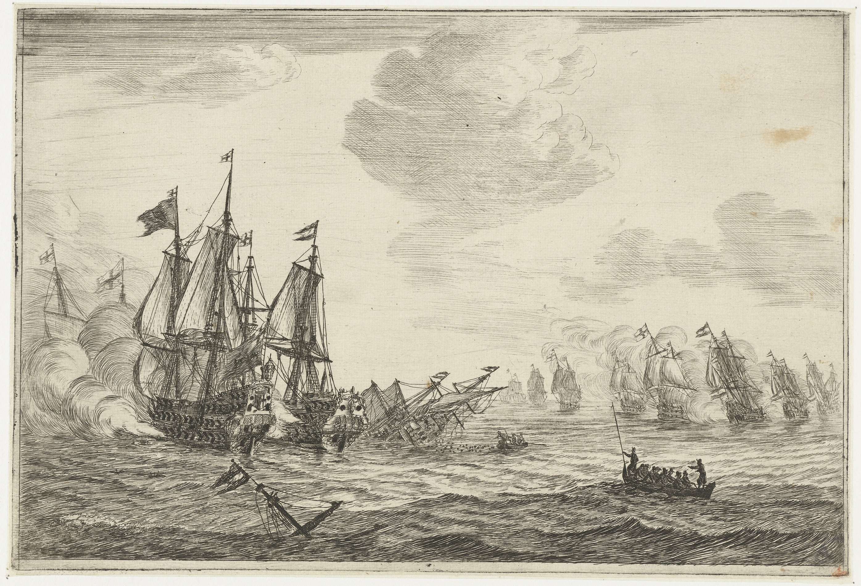 Zeeslag tussen Nederlandse en Engelse schepen. In het midden een zinkend schip, twee reddingssloepen met mensen, mast van een tweede gezonken schip nog zichtbaar.