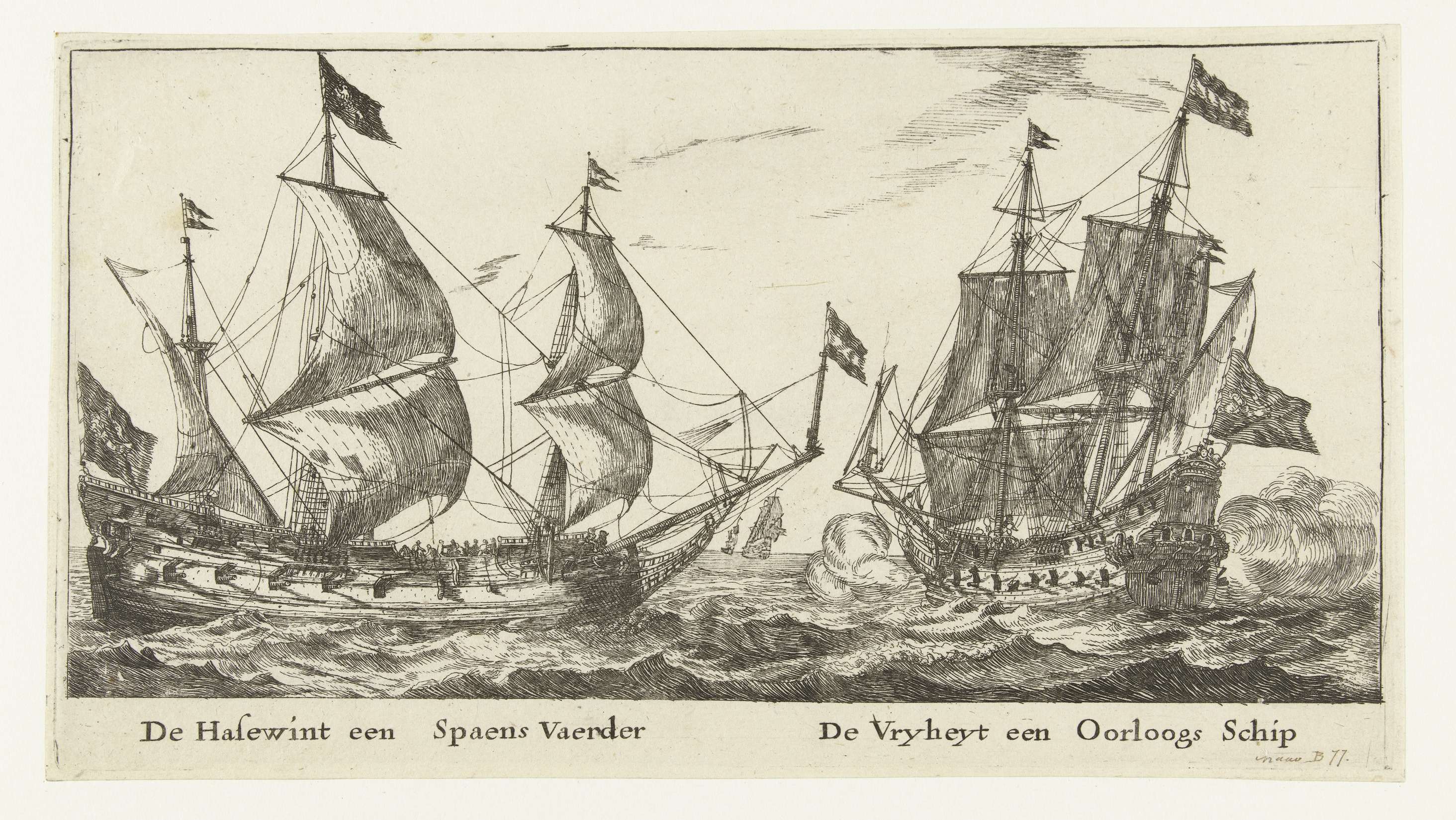 Zeeslag met een aantal zinkende en brandende schepen en vele mensen in het water.