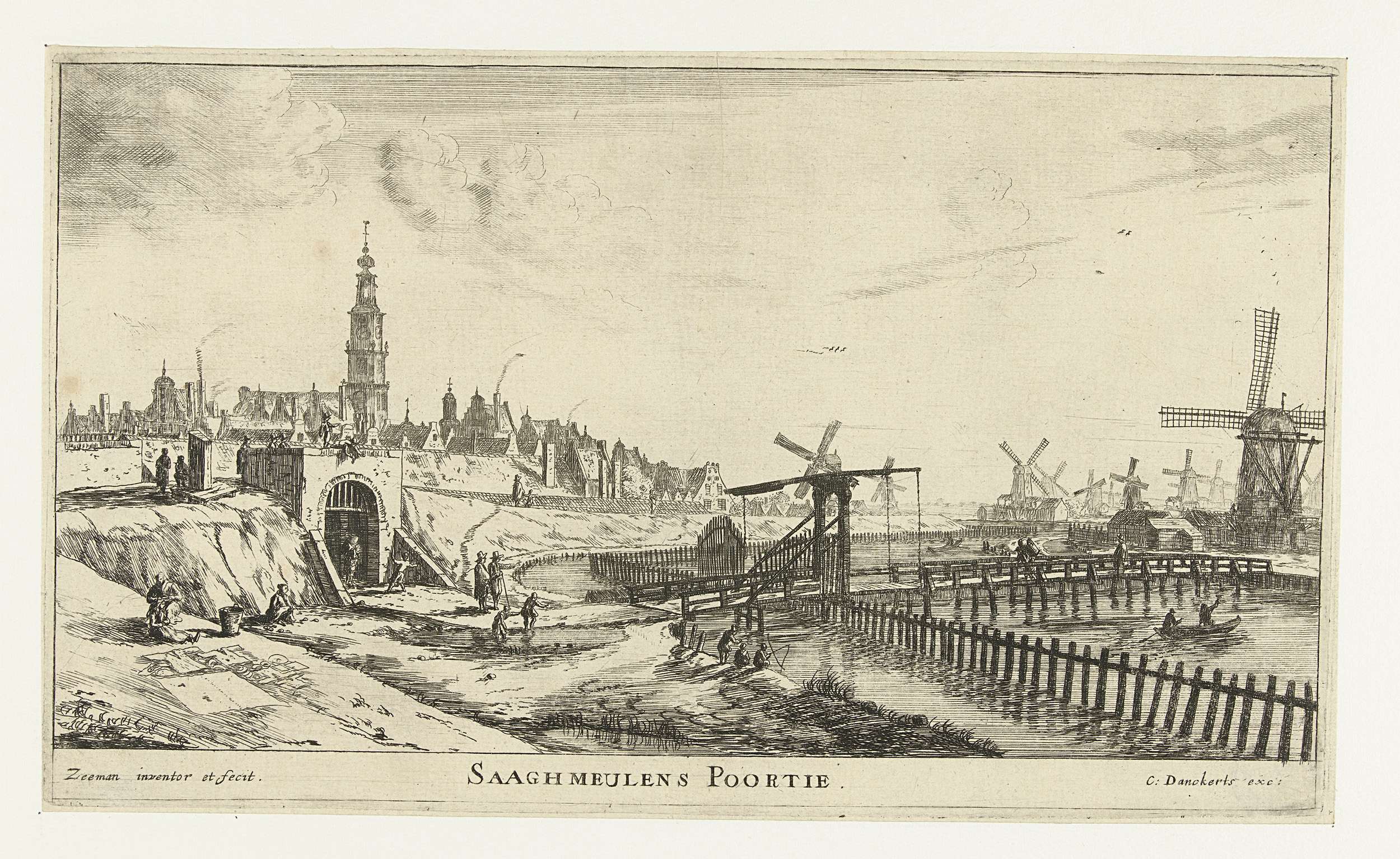 Gezicht op de Zaagmolenpoort en de bijhorende brug te Amsterdam, gezien vanaf het bolwerk de Kartuizers. Links op de voorgrond wordt was gebleekt. Links op de achtergrond de Westertoren. Rechts achter de brug vele molens. Onderdeel van een prentserie van Amsterdamse stadspoorten.