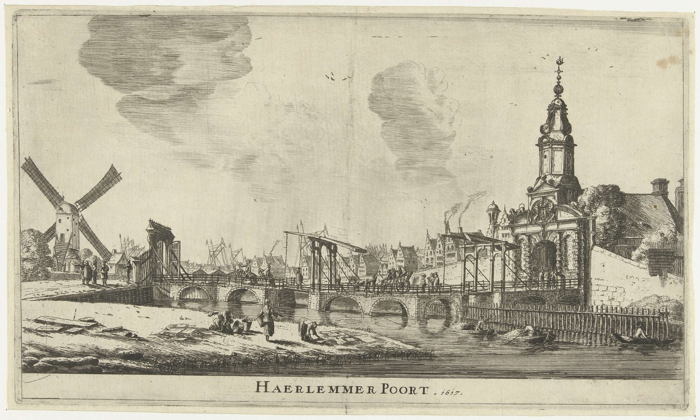 Gezicht op de Haarlemmerpoort en de bijhorende brug te Amsterdam, gezien van buiten de stad richting het noorden. Deze door Hendrik de Keyser ontworpen Haarlemmerpoort werd tussen 1615 en 1618 gebouwd. Op de voorgrond wordt was gebleekt. Op de brug en op de oever verschillende figuren. Links de molen De Westerbeer, ook bekend als De ...