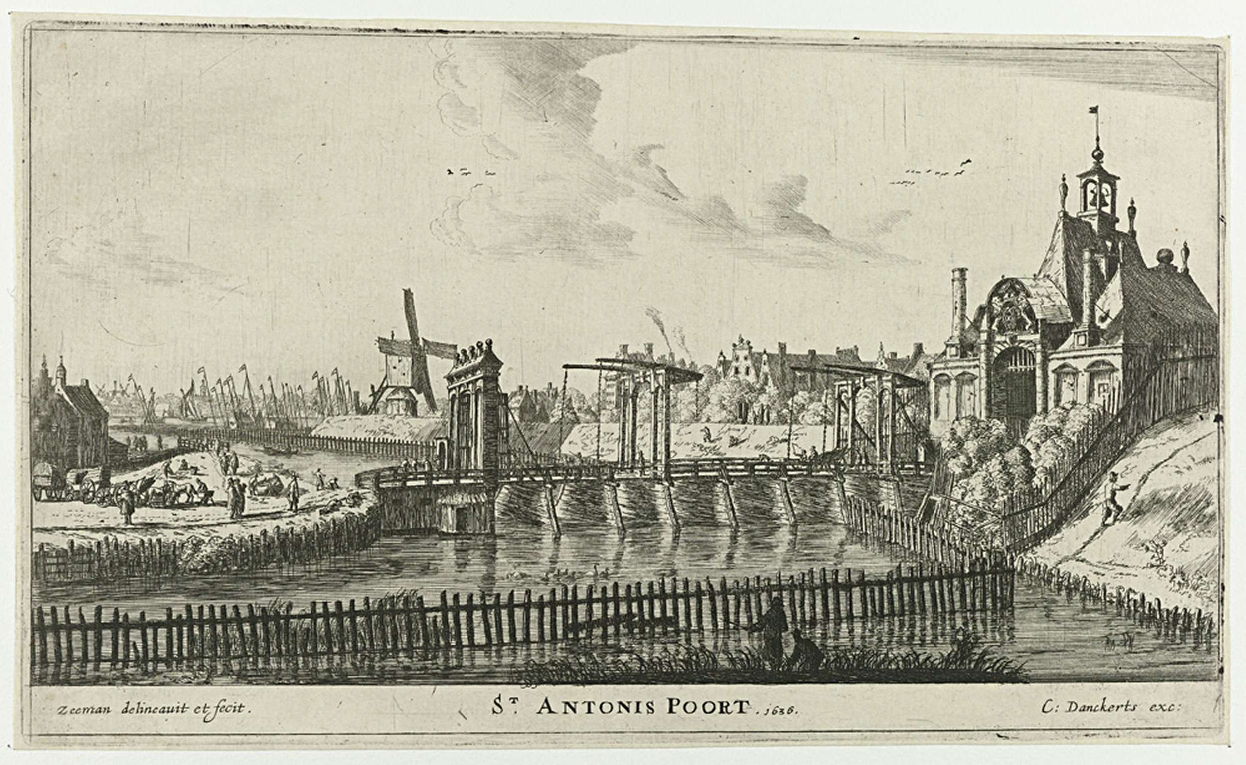 Gezicht op de in 1636 gebouwde Tweede Sint-Antoniespoort en de bijhorende brug te Amsterdam, gezien van buiten de stad. Op de oever en op de brug verschillende figuren. Na de Vierde Uitleg en de bouw van de Eerste Muiderpoort (1663) had dit gebouw zijn functie als stadspoort verloren. In 1670 zou het worden gesloopt. Onderdeel ...
