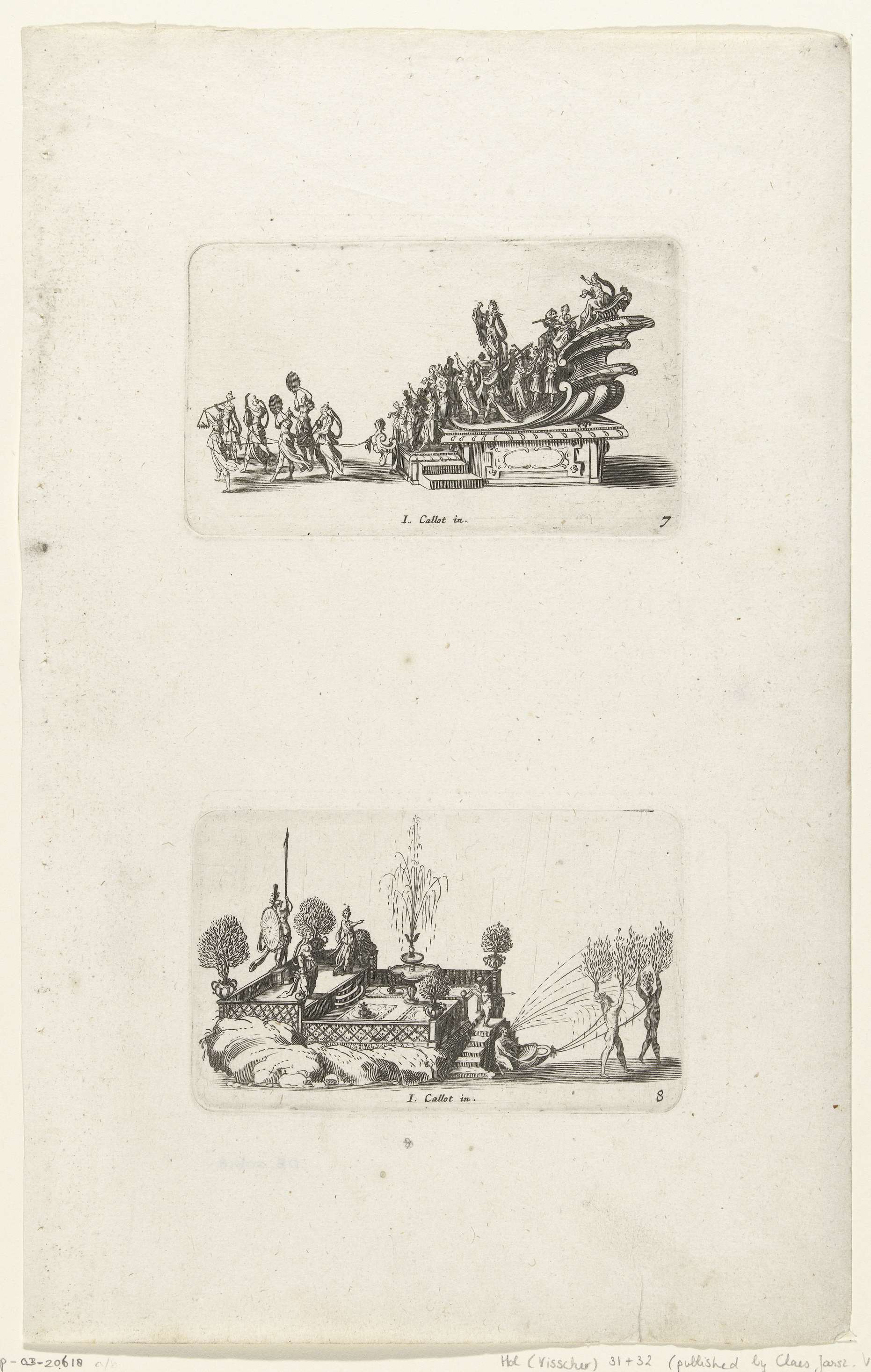 Bovenste prent: Apollo met een lier en een groep muzikanten en zangers op een podium, voortgetrokken door zes musicerende dames. Onderste prent: een omheinde tuin met Juno, Minerva en Venus, voortgetrokken door twee als bomen verklede mensen. Deze prenten zijn onderdeel van een serie prenten van triomfwagens, kopieën in spiegelbeeld naar details van illustraties uit ...