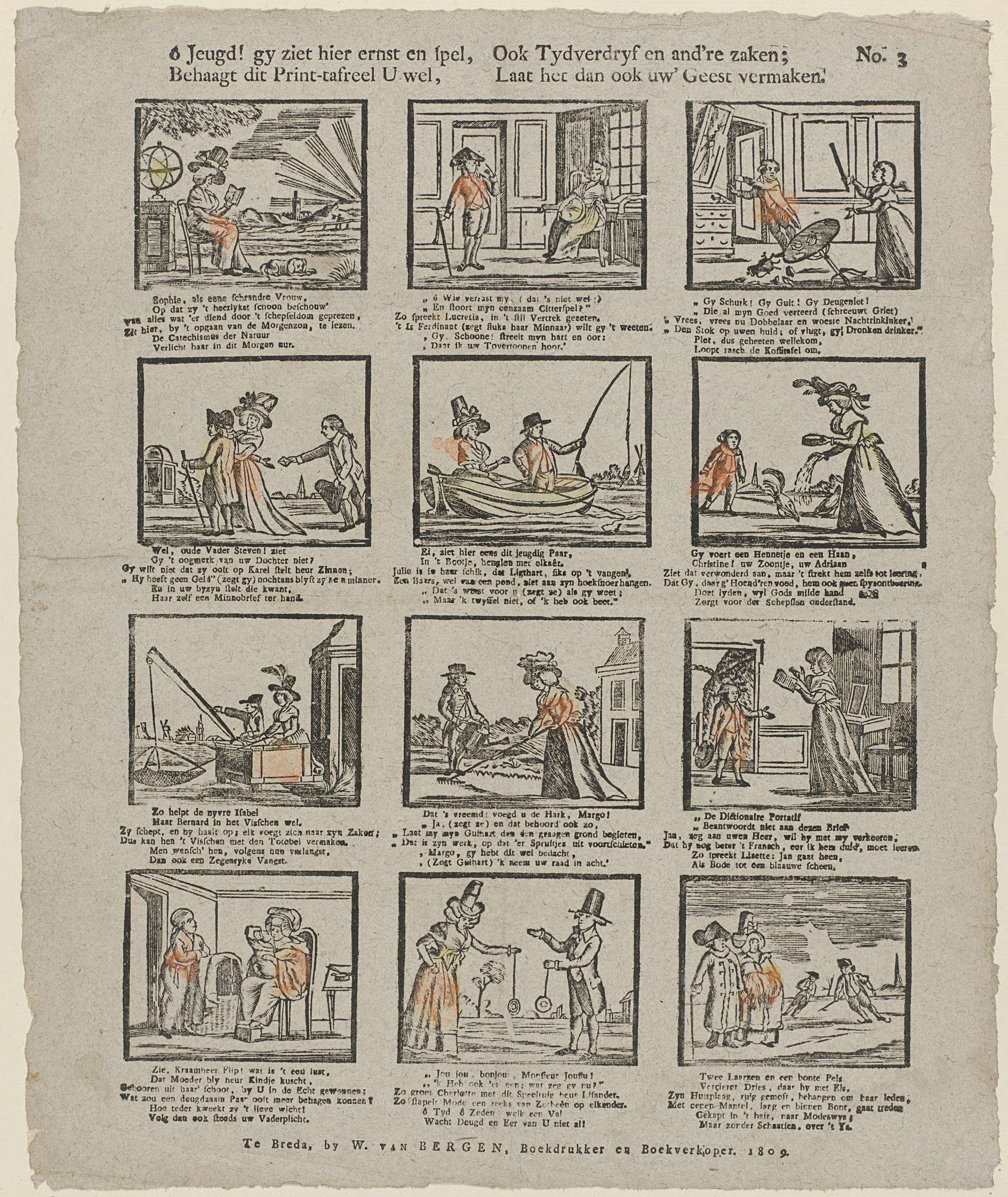 Blad met 12 voorstellingen van verschillende bezigheden, zoals hengelen, spelen met de jojo en kippen voeren. Onder elke afbeelding een zesregelig vers. Genummerd rechtsboven: No. 3.