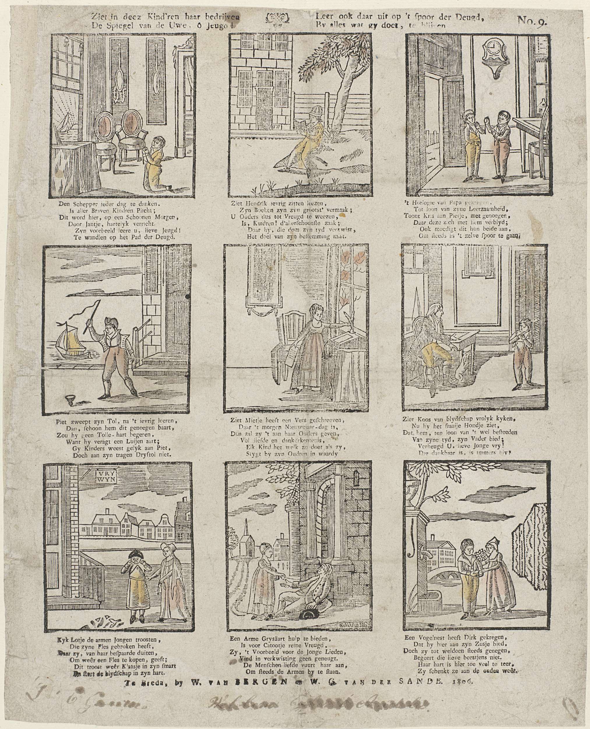 Blad met 9 voorstellingen van kinderen die worden beloond voor deugdzaam gedrag. Onder elke afbeelding een zesregelig vers. Genummerd rechtsboven: No. 9.