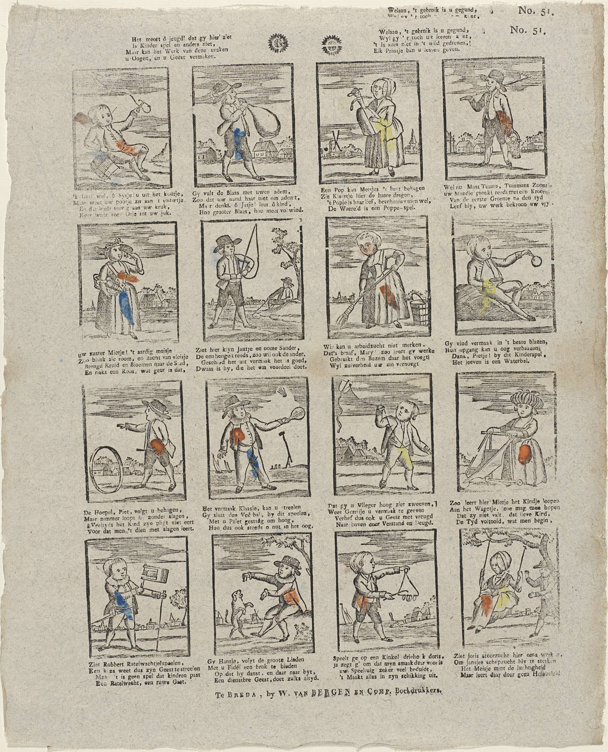 Blad met 16 voorstellingen van verschillende kinderspelen, zoals spelen met poppen, hoepelen en vliegeren. Onder elke afbeelding een vierregelig vers. Genummerd rechtboven: No. 51.