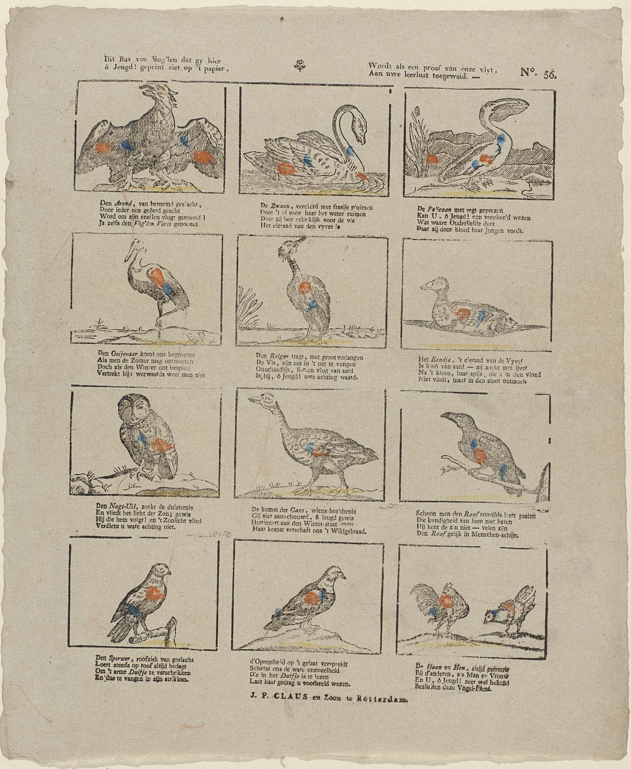 Blad met 12 voorstellingen van vogels, zoals een zwaan, een uil en een duif. Onder elke afbeelding een vierregelig vers. Genummerd rechtsboven: No. 56.
