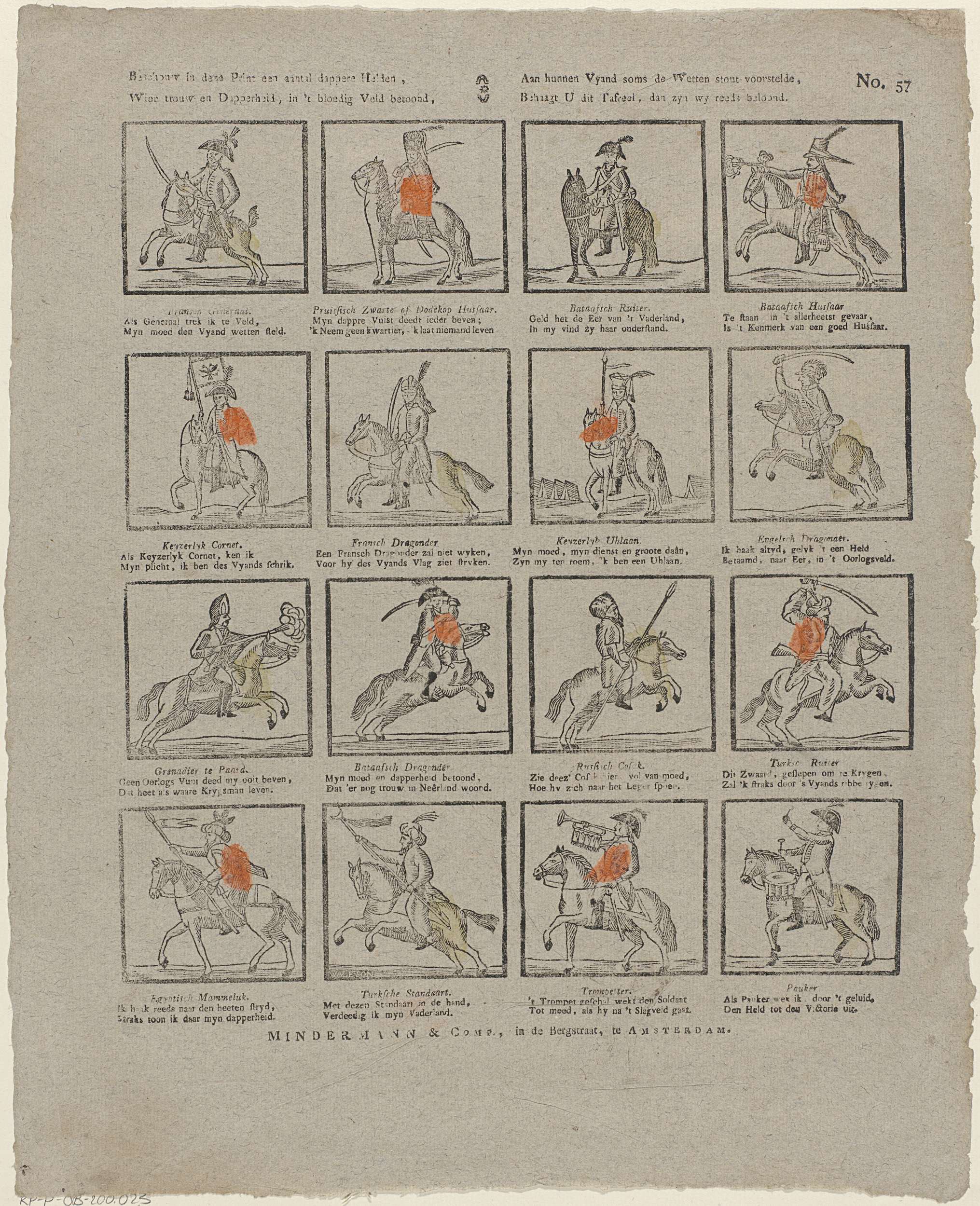 Blad met 16 voorstellingen van militairen te paard. Onder elke afbeelding een naam en tweeregelig vers. Genummerd rechtsboven: No. 57.