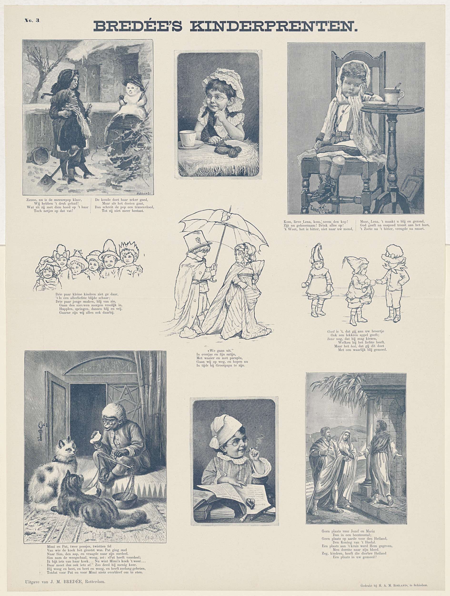 Blad met 9 voorstellingen van verschillende aard, waaronder twee kinderen die een sneeuwpop bouwen en een kleuter die rookt. Onder elke afbeelding vier tot acht regels vers. Genummerd linksboven: No. 3.