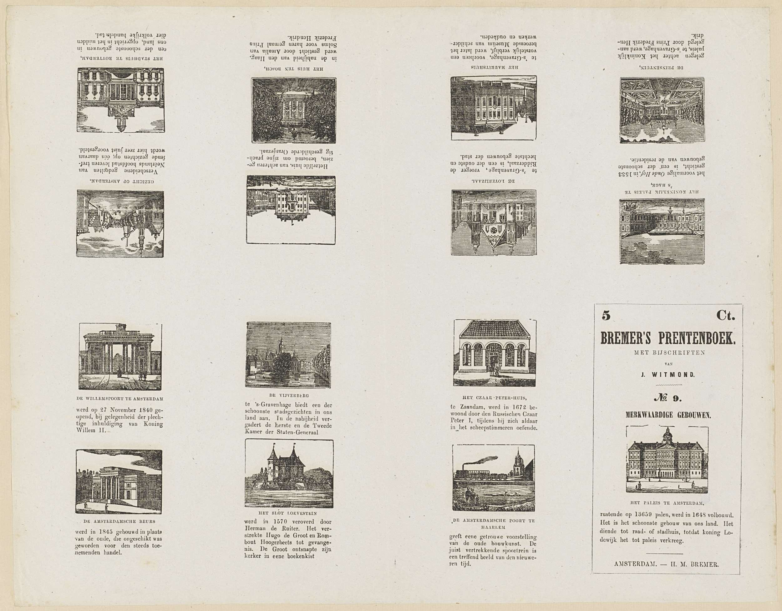 Blad met 14 voorstellingen van Nederlandse gebouwen, waaronder Slot Loevestein, het Mauritshuis en het Stadhuis te Rotterdam. Onder elke voorstelling de naam van het gebouw en drie tot vijf regels vers. Rechtsonder een blok met titels en uitgeversadres en een voorstelling van het paleis op de Dam te Amsterdam. Genummerd onder titel: No. 9.