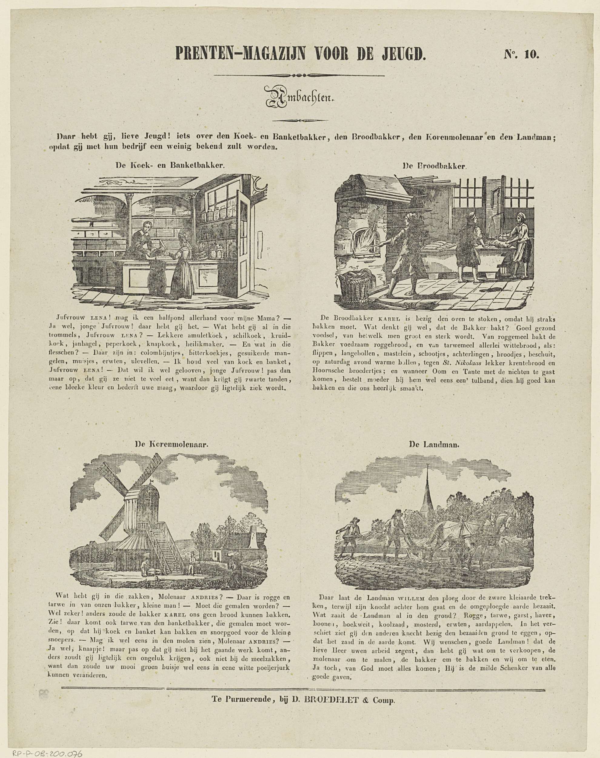 Blad met 4 voorstellingen van ambachtslieden: een koek- en banketbakker, een broodbakker, een molenaar en een boer. Boven elke voorstelling een titel en onder elke voorstelling negen tot tien regels tekst. Genummerd rechtsboven: No. 10.