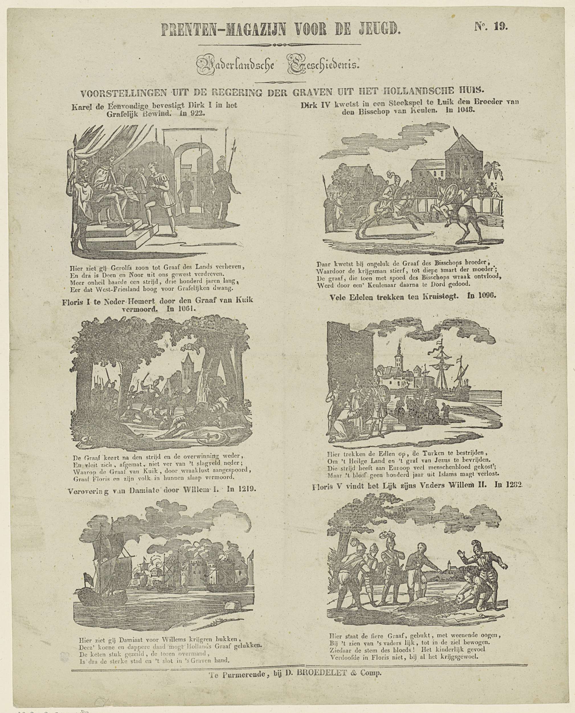 Blad met 6 voorstellingen van de regering van verschillende graven van Holland, onder wie Dirk I, Dirk IV, Floris I en Floris V. Boven elke voorstelling een titel en een jaartal, onder elke voorstelling een vierregelig vers. Genummerd rechtsboven: No. 3.
