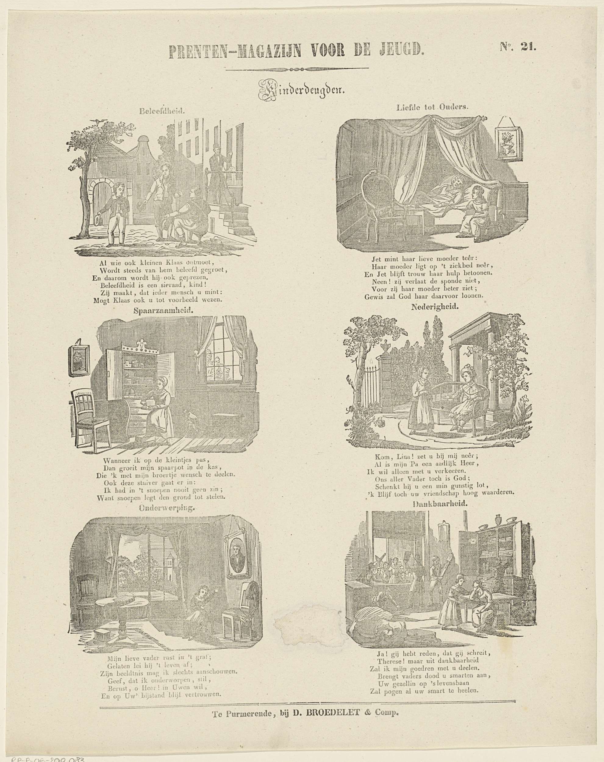 Blad met 6 voorstellingen van kinderdeugden, zoals beleefdheid, spaarzaamheid en dankbaarheid. Boven elke voorstelling een titel, onder elke voorstelling een zesregelig vers. Genummerd rechtsboven: No. 21.