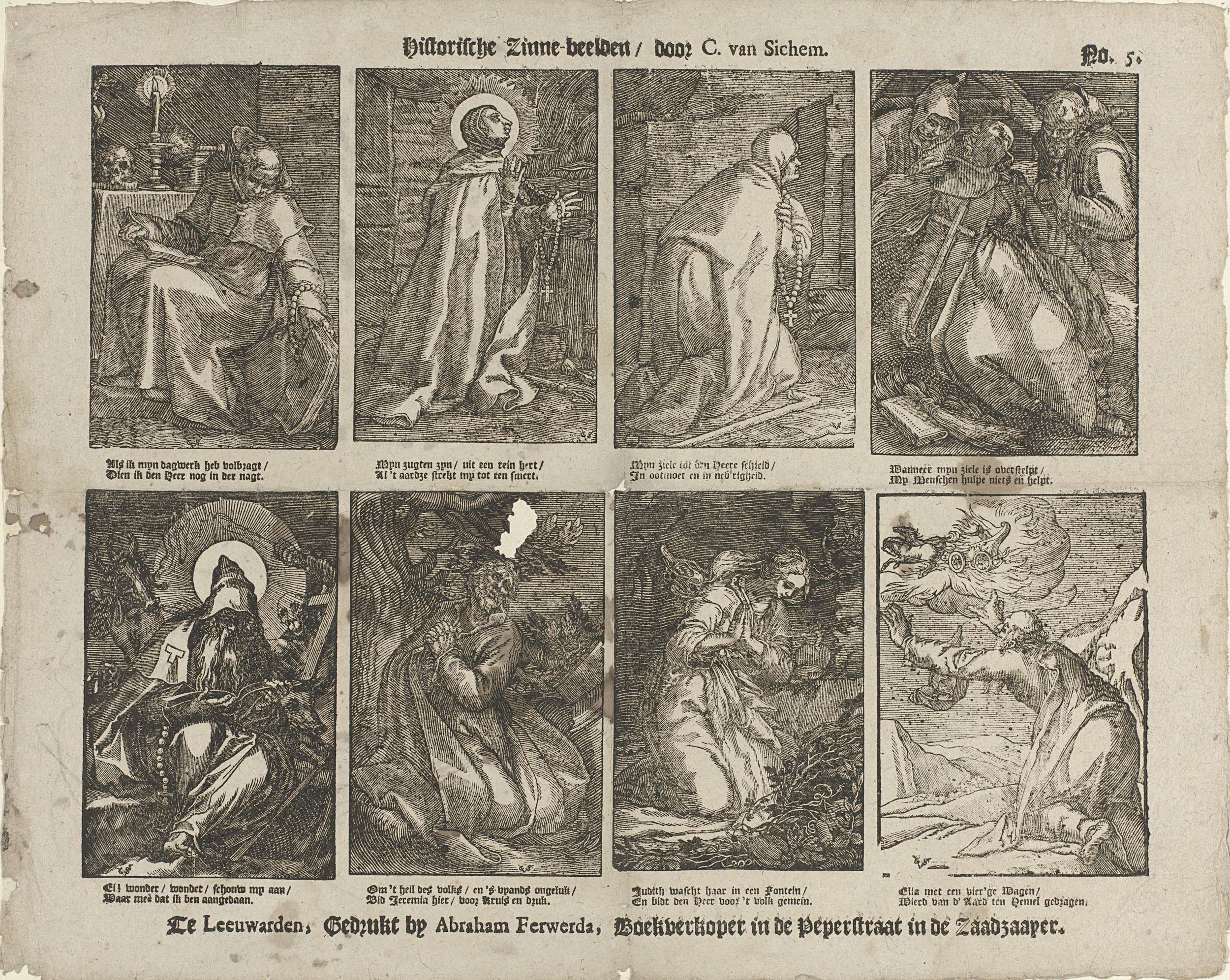 Blad met 8 Bijbelse taferelen en andere godsdienstige voorstellingen, zoals de biddende Jeremia en de biddende Judith. Onder elke voorstelling een tweeregelig vers. Genummerd rechtsboven: No. 5.