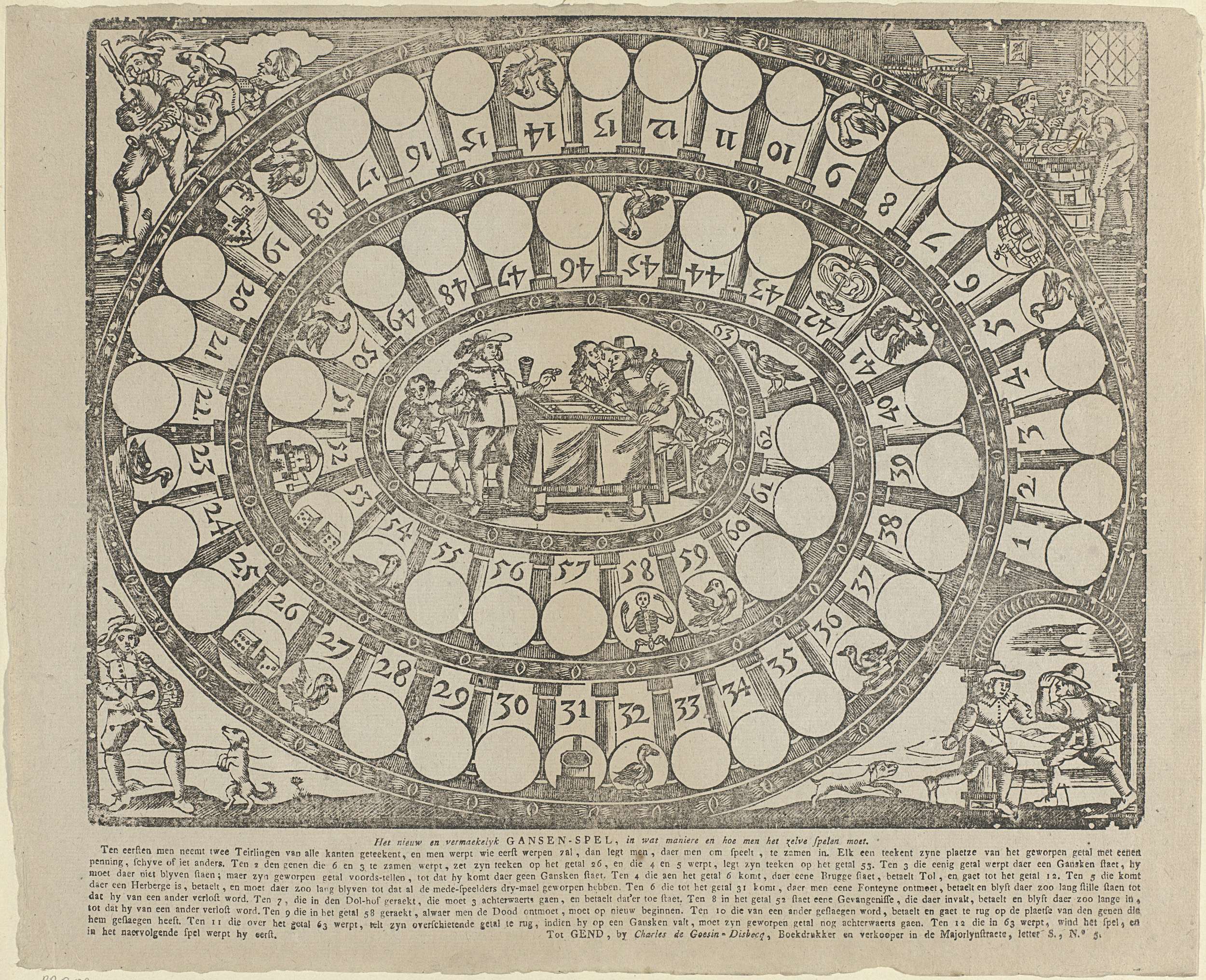 Ovaal bordspel met vakjes genummerd 1-63. Op het middenveld een voorstelling van een herberg/bordeelscène met twee mannen, een vrouw en twee kinderen rond een tafel, de mannen spelen backgammon. In de vier hoeken van het spel mannen die muziek maken, dansen en spelletjes spelen. Onder de voorstelling de spelregels.