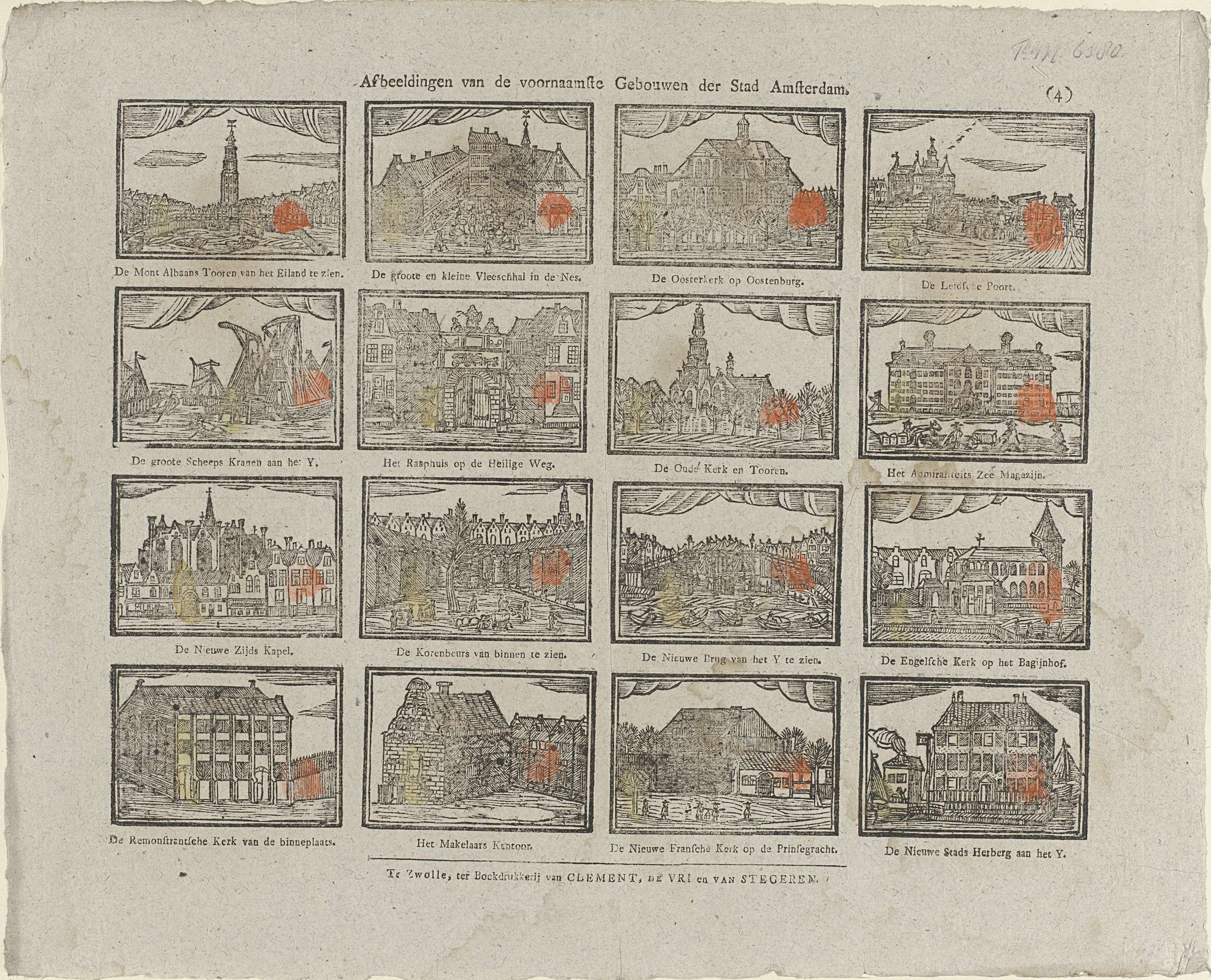 Blad met 16 voorstellingen van bekende gebouwen in Amsterdam, zoals de Oosterkerk, de Leidse Poort en de Korenbeurs. Onder elke voorstelling de naam van het gebouw. Genummer rechtsboven: (4).