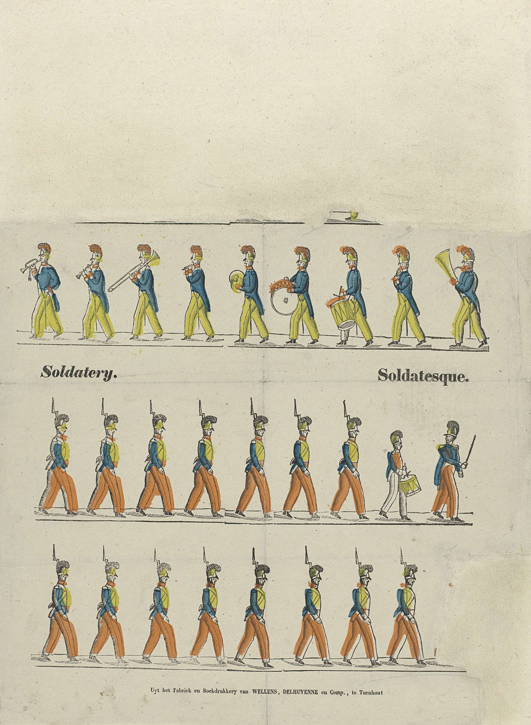 Drie horizontale rijen met elk negen soldaten. Op de bovenste rij militaire muzikanten. Op de onderste rij een officier, een tamboer en zestien soldaten.