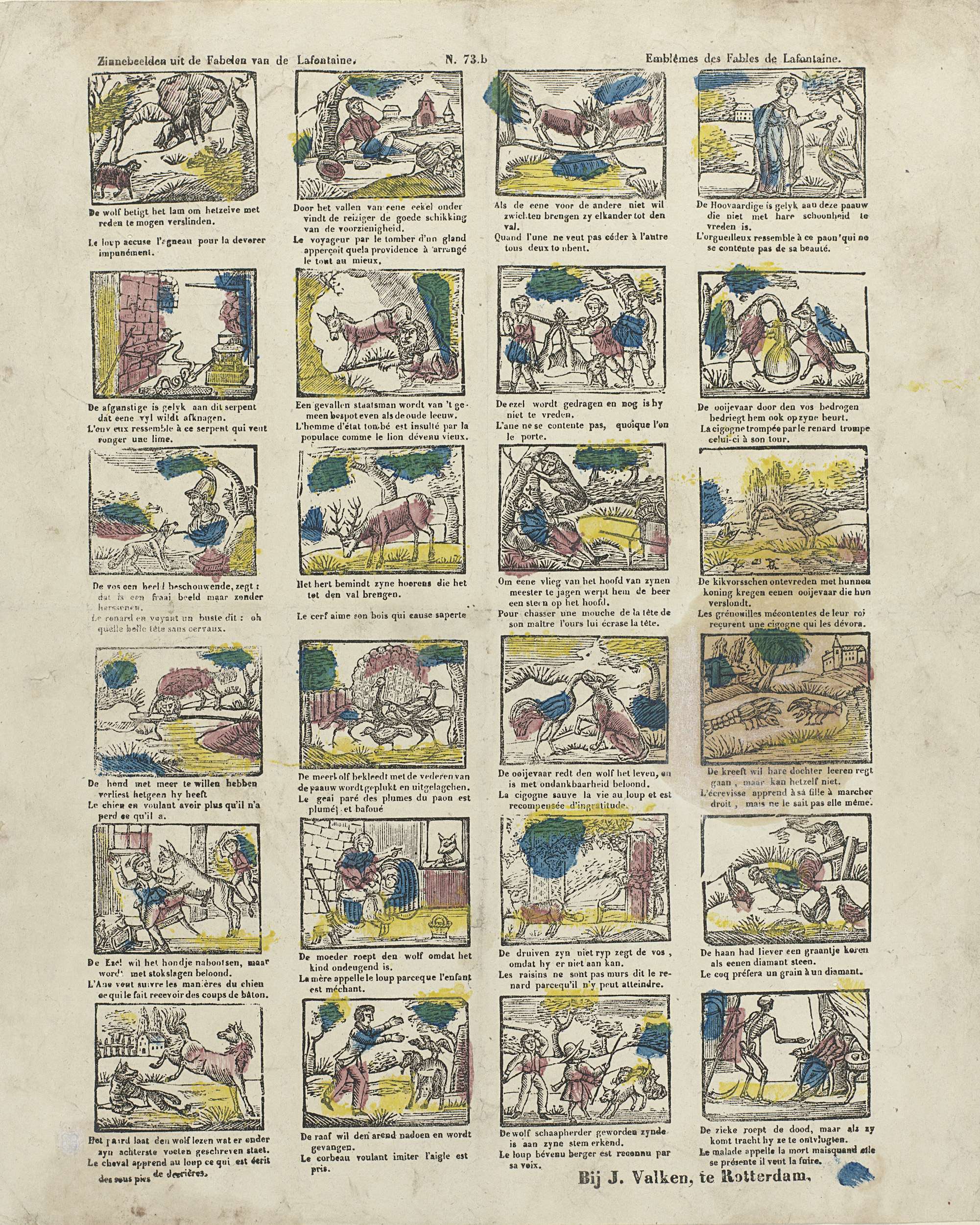 Blad met 24 voorstellingen uit de fabels van Jean de La Fontaine, waarin dieren met menselijke eigenschappen centraal staan en waar een moraal wordt verteld. Onder elke voorstelling een vierregelig vers. Genummerd midden boven: N. 73.b