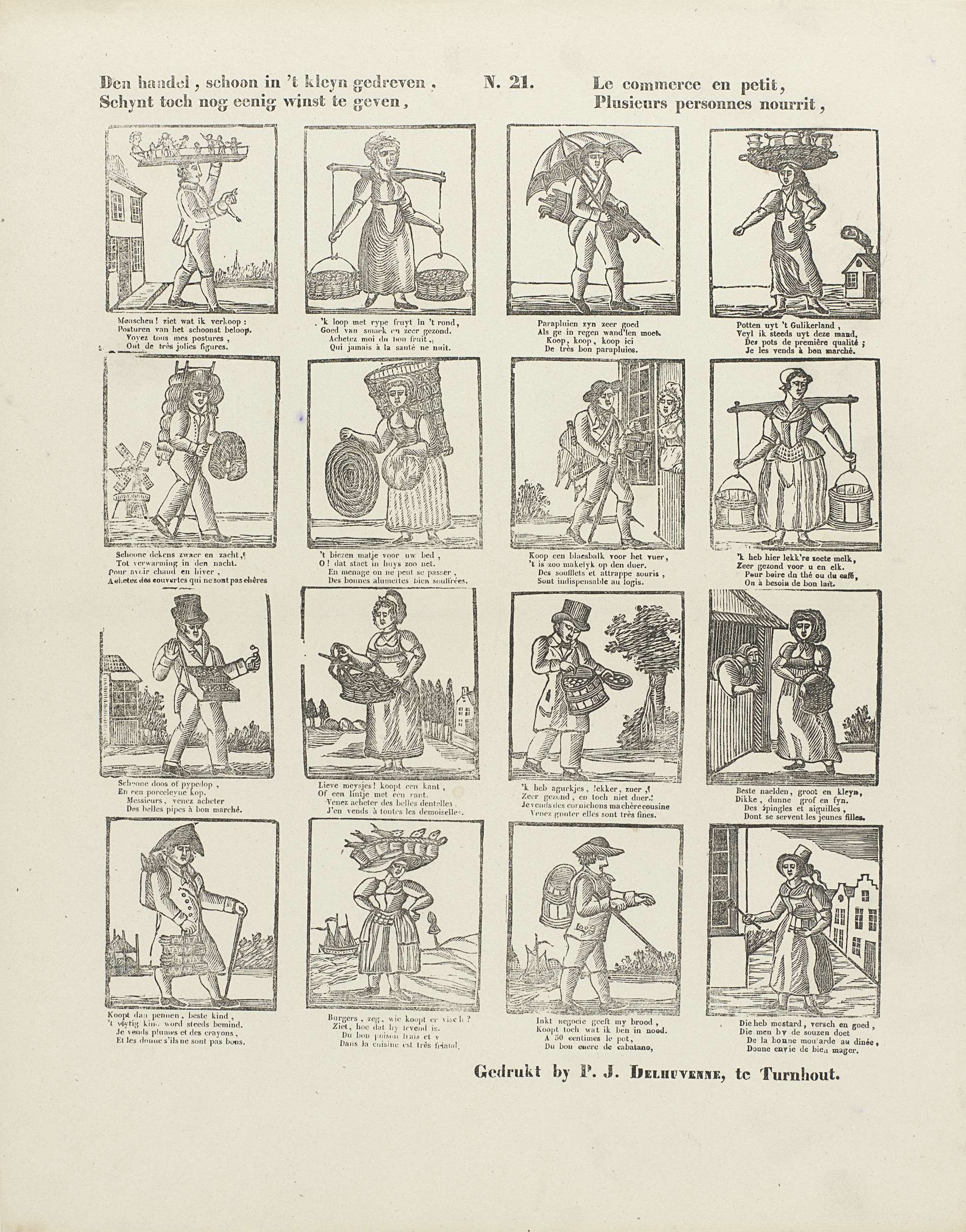 Blad met 16 voorstellingen van straatverkopers, zoals een fruitverkoopster, een dekenverkoper en een visverkooptster. Onder elke voorstelling een tweeregelig vers in het Nederlands en het Frans. Genummerd midden boven: N. 21.