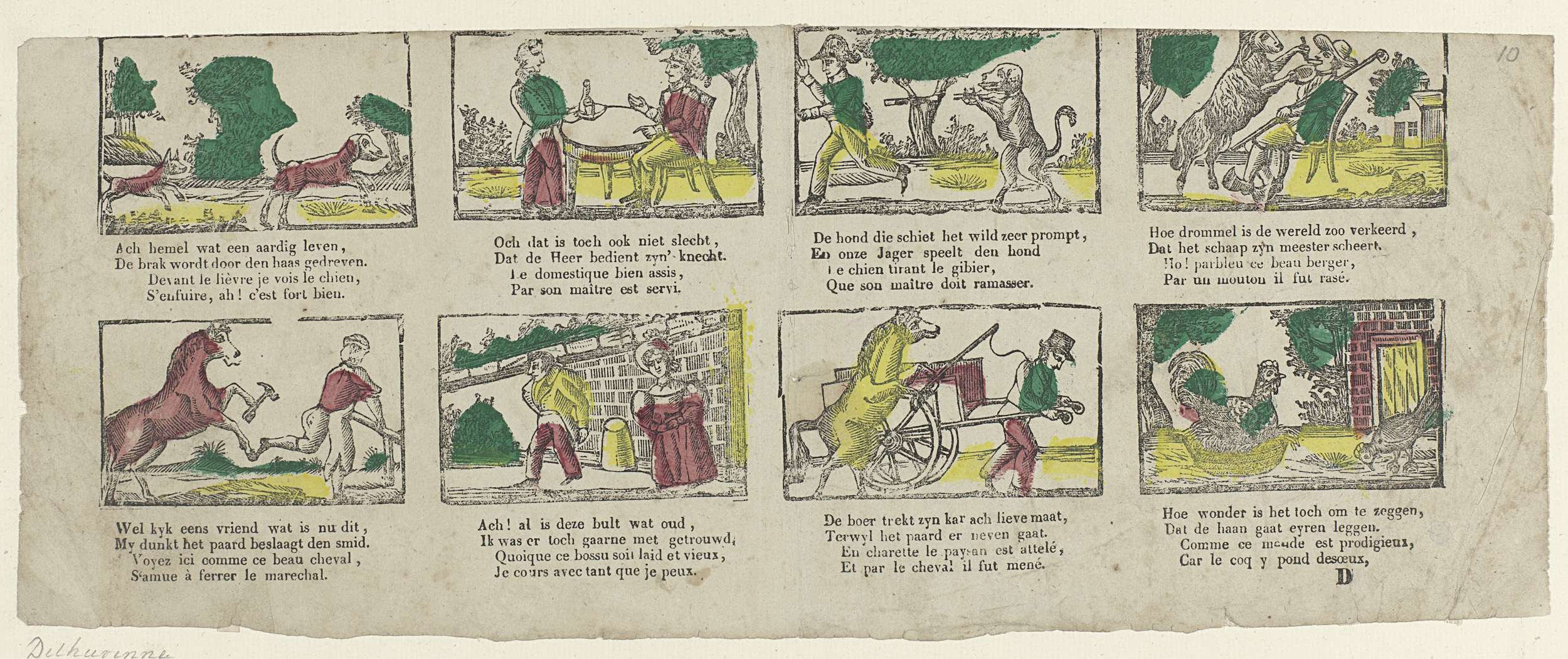 Blad met 8 voorstellingen van allerlei voorwerpen, dieren en figuren. Onder elke voorstelling een tweeregelig vers in het Nederlands en het Frans.