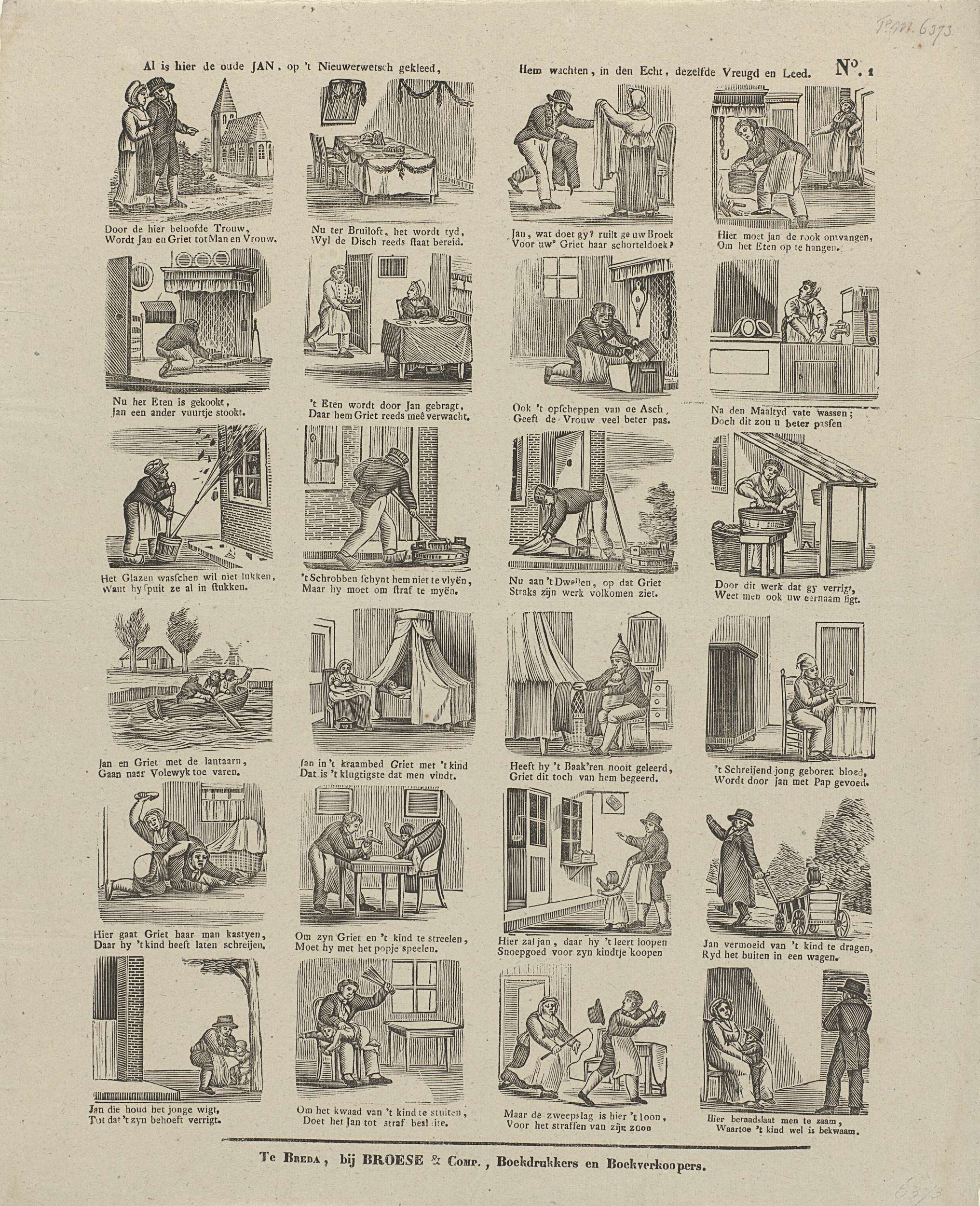 Blad met 24 voorstellingen uit het leven van Jan de Wasser, een man die van zijn vrouw Griet, die de broek aan heeft, al het huishoudelijk werk moet doen. Onder elke voorstelling een tweeregelig vers. Genummerd rechtsboven: No. 1.