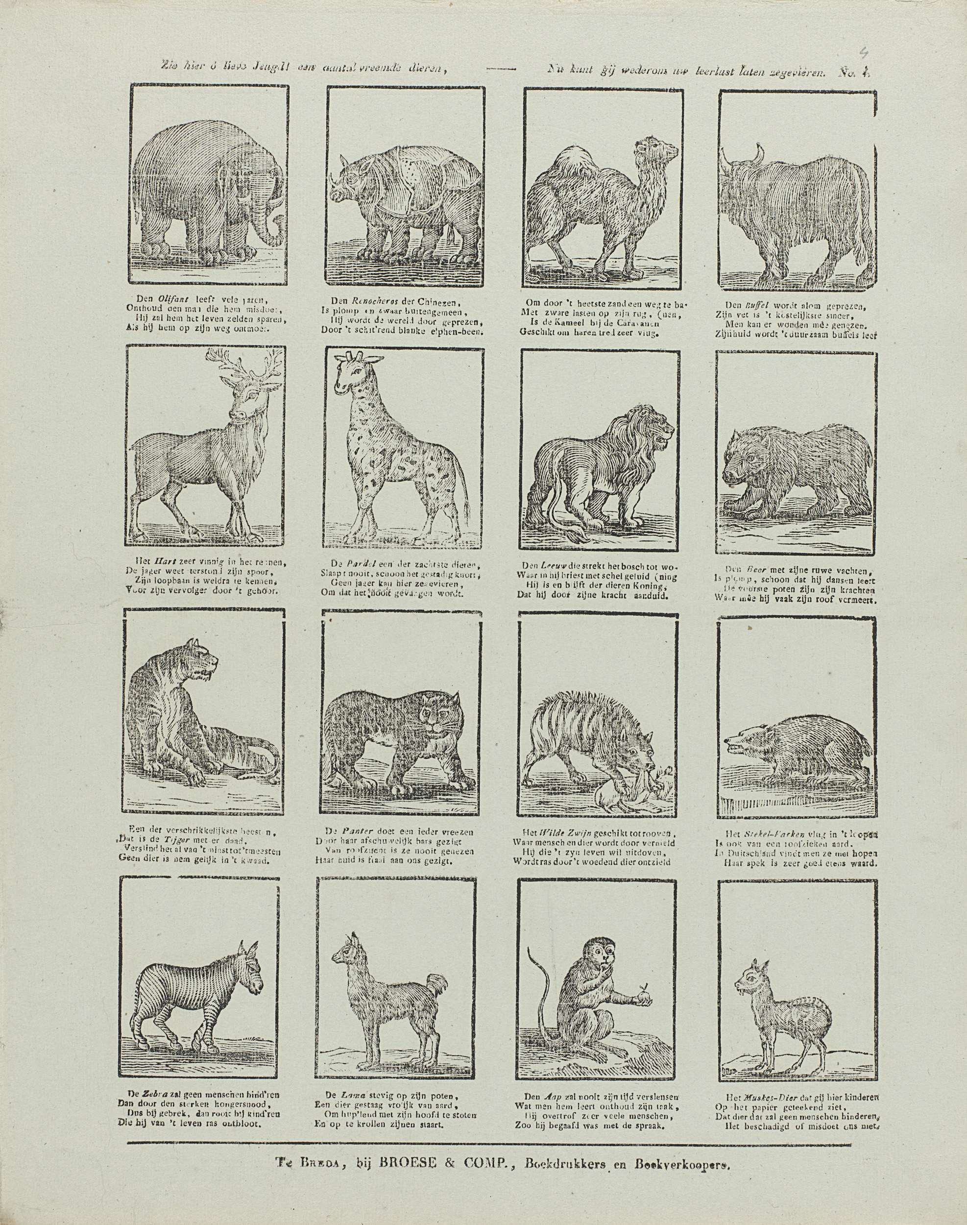 Blad met 16 voorstellingen van wilde dieren, waaronder een neushoorn, een kameel, een giraf en een aap. Onder elke voorstelling een vierregelig vers. Genummerd rechtsboven: No. 4.