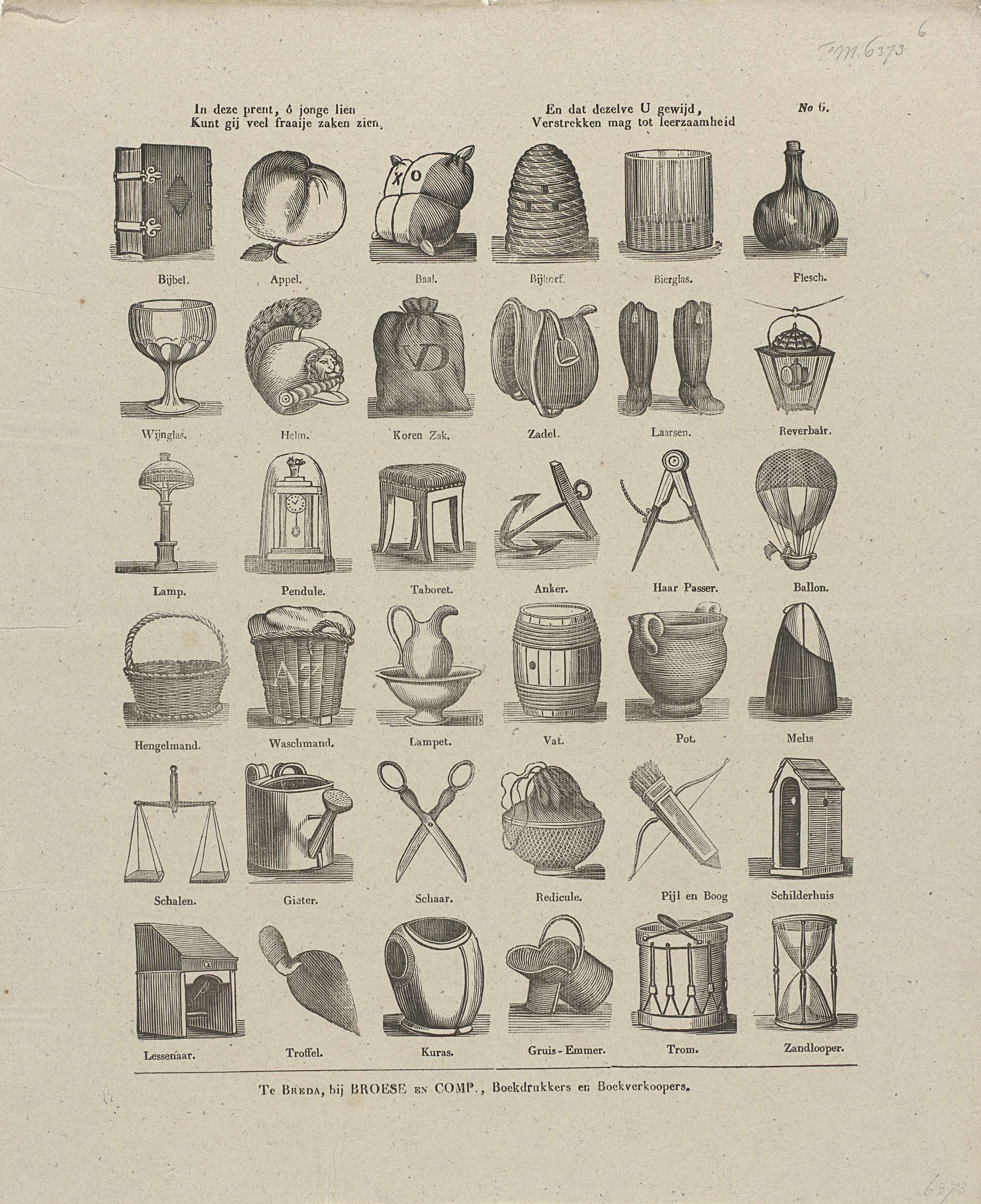 Blad met 36 voorstellingen voorwerpen, waaronder een Bijbel, een bijenkorf, een luchtballon, een lampet en een trommel. Onder elke voorstelling een onderschrift. Genummerd rechtsboven: No. 6.