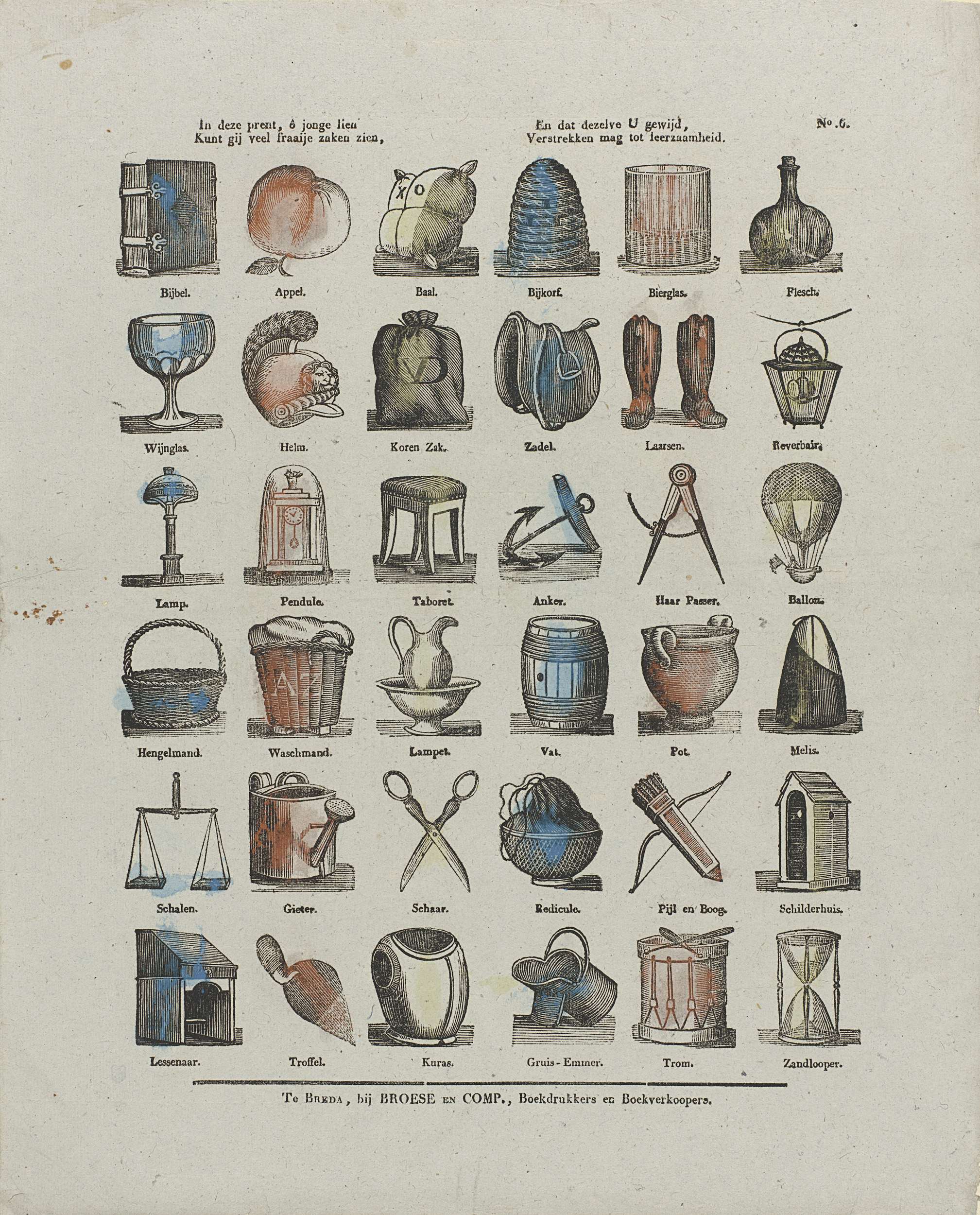 Blad met 36 voorstellingen voorwerpen, waaronder een Bijbel, een bijenkorf, een luchtballon, een lampet en een trommel. Onder elke voorstelling een onderschrift. Genummerd rechtsboven: No. 6.