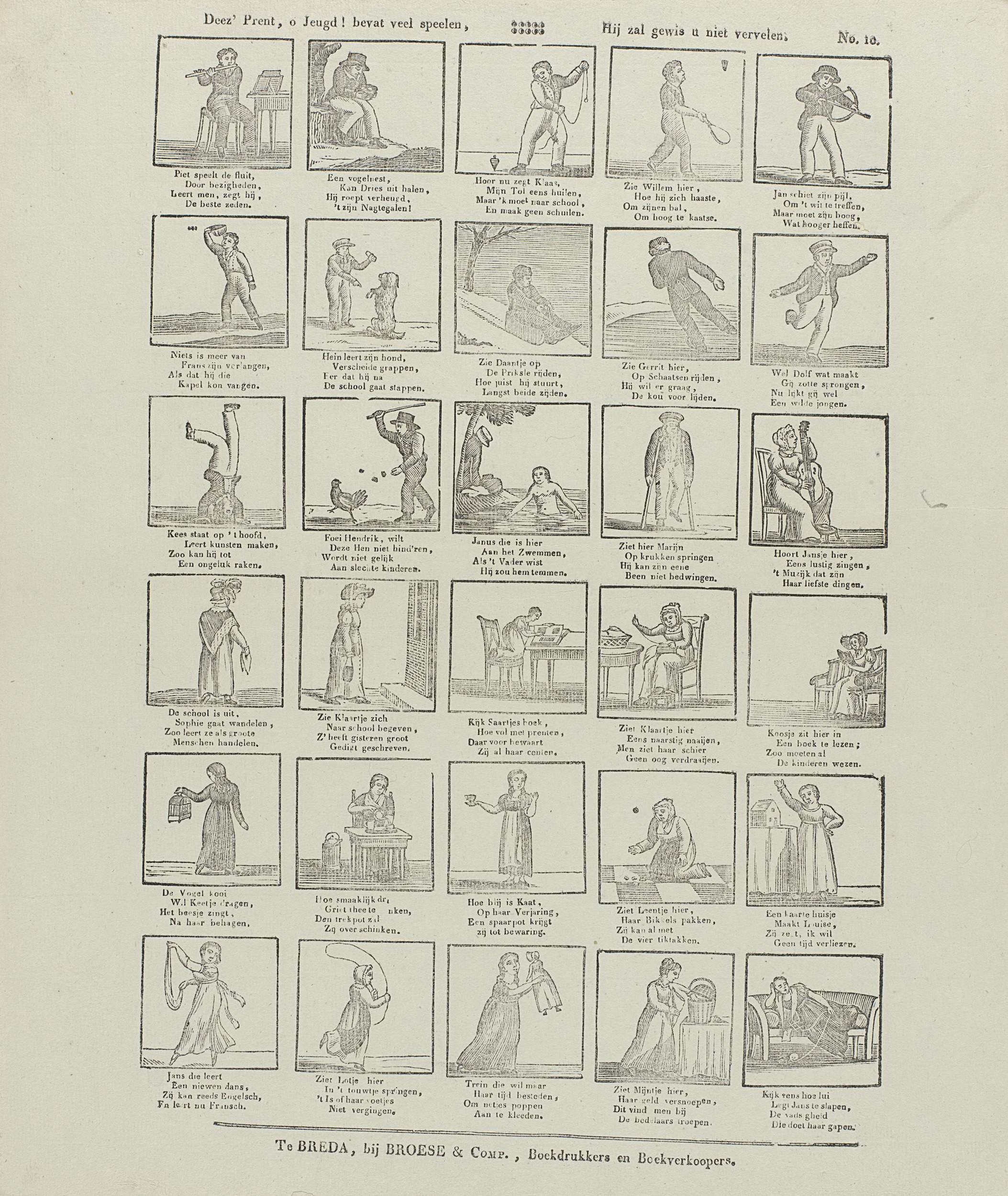 Blad met 30 voorstellingen van kinderspelen, waaronder fluit spelen, tollen, op het hoofd staan en een kaartenhuis bouwen. Onder elke voorstelling een vierregelig vers. Genummerd rechtsboven: No. 10.