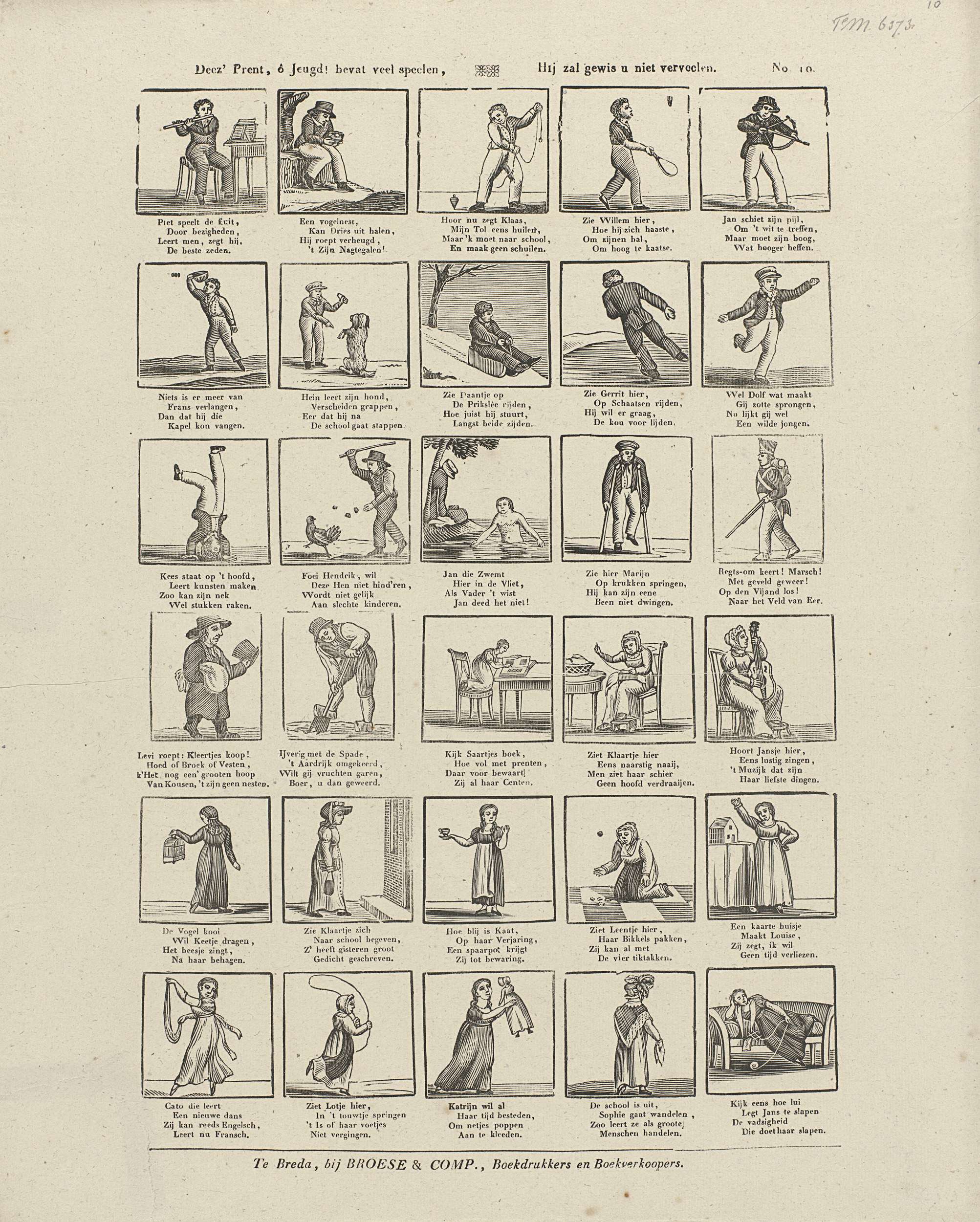Blad met 30 voorstellingen van kinderspelen, zoals fluit spelen, tollen, op het hoofd staan en een kaartenhuis bouwen. Onder elke voorstelling een vierregelig vers. Genummerd rechtsboven: No. 10.