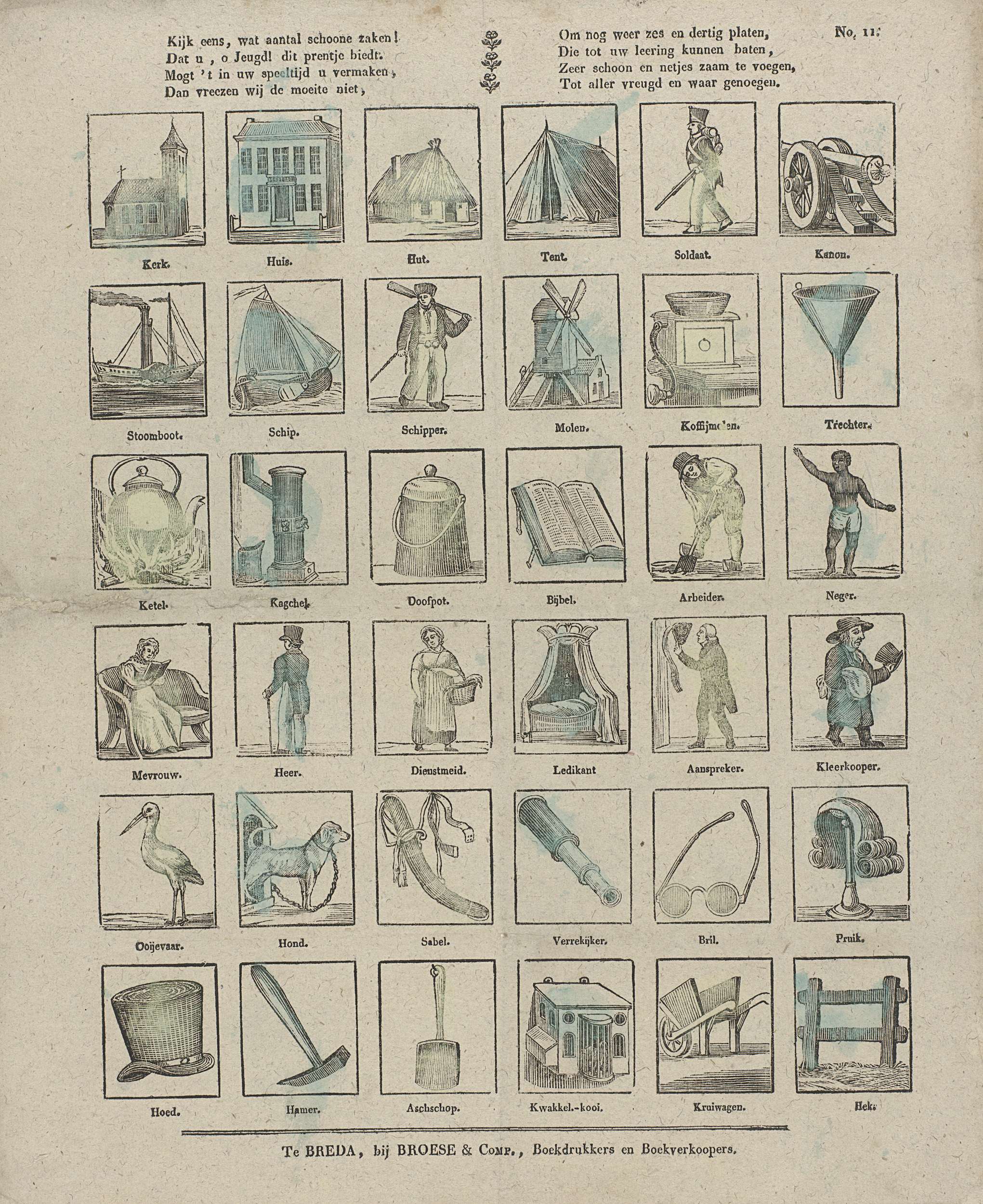 Blad met 36 voorstellingen van voorwerpen, gebouwen, dieren en figuren, waaronder een hut, een schipper, een ooievaar en een pruik. Onder elke voorstelling een onderschrift. Genummerd rechtsboven: No. 11.