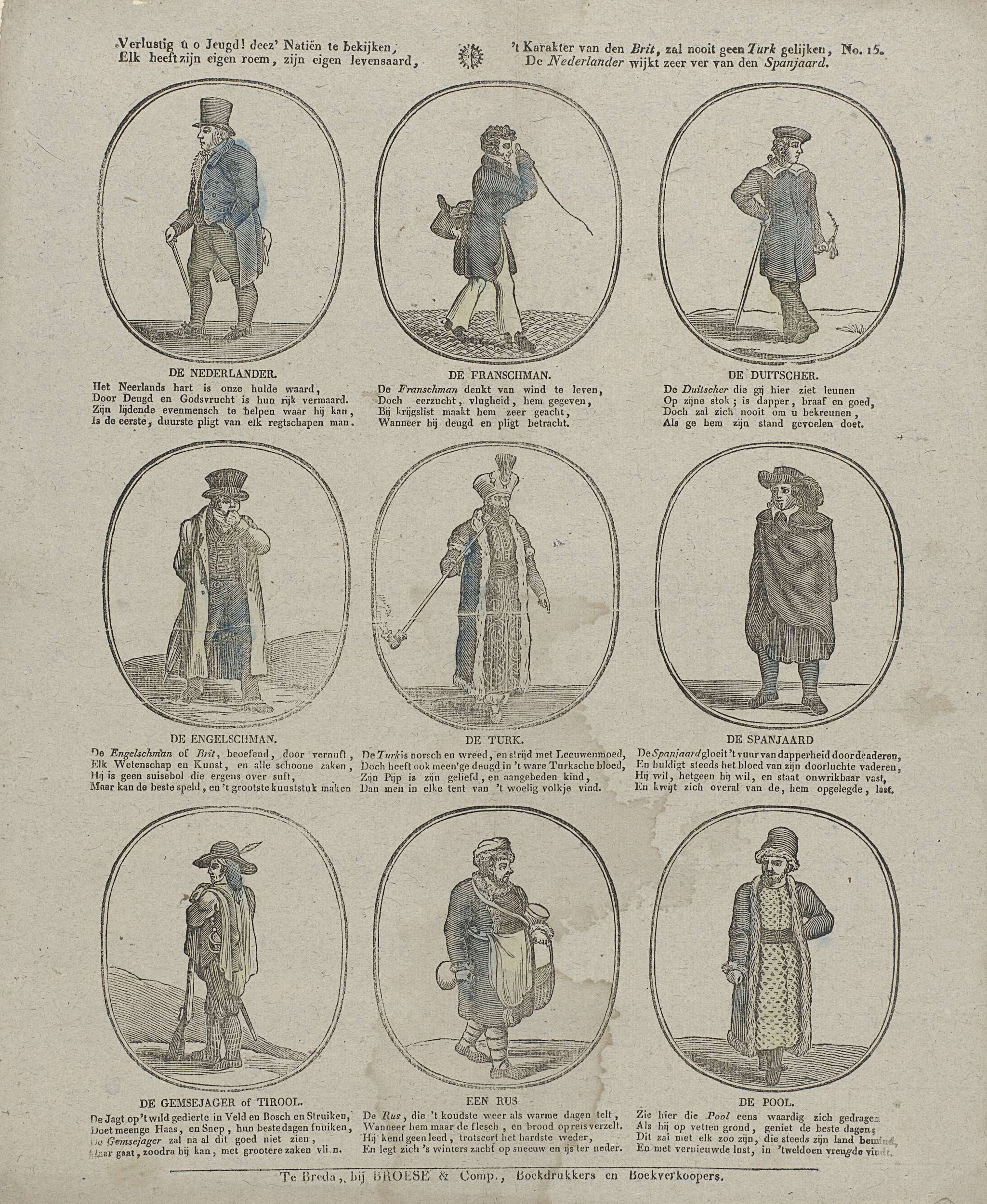 Blad met 9 voorstellingen van mensen van verschillende nationaliteiten, waaronder een Fransman, een Turk en een Rus. Onder elke voorstelling een titel en een vierregelig vers. Genummerd rechtsboven: No. 15.