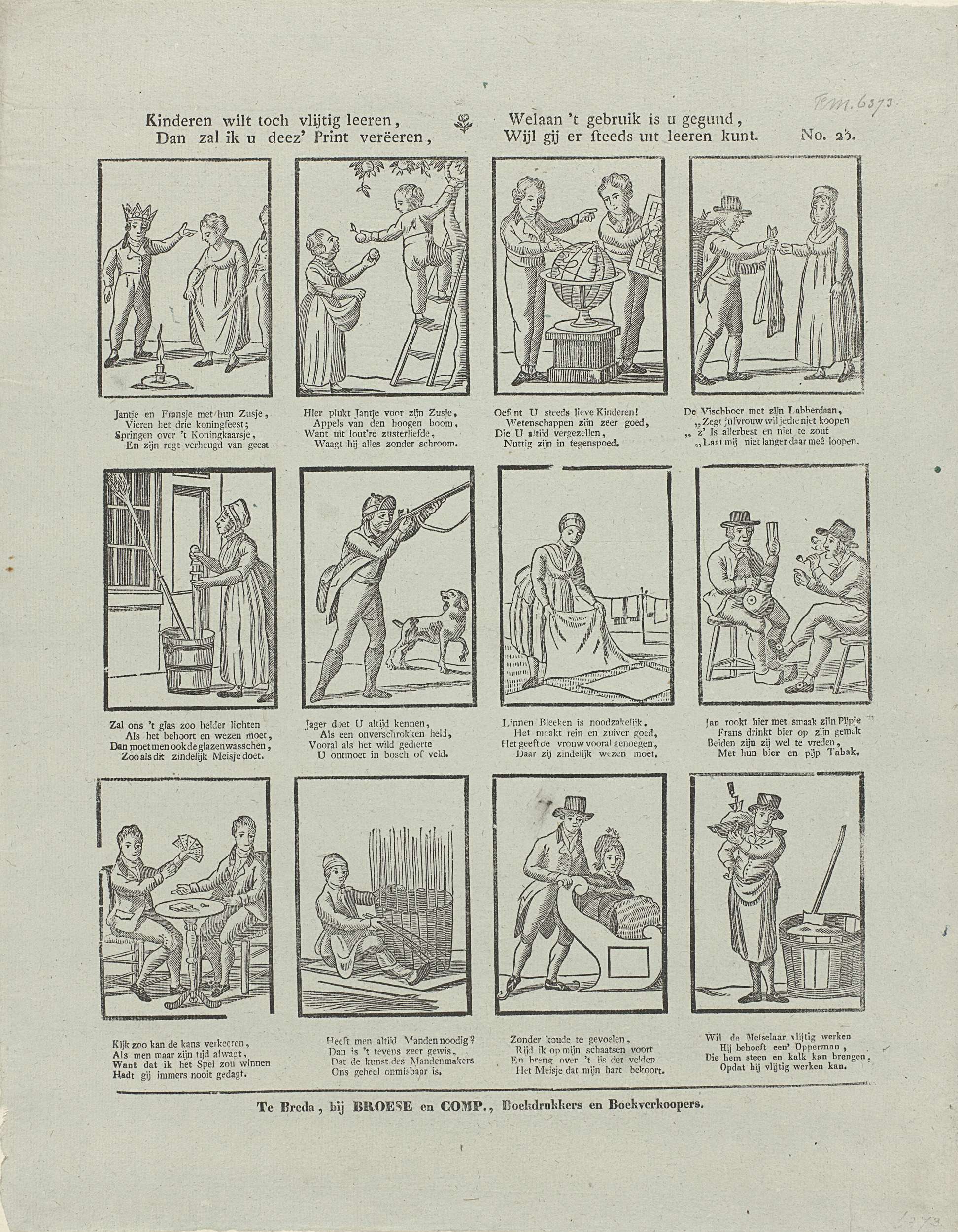 Blad met 12 voorstellingen van verschillende bezigheden, zoals mandenvlechten, roken en kaarten. Onder elke afbeelding een vierregelig vers. Genummerd rechtsboven No. 23.