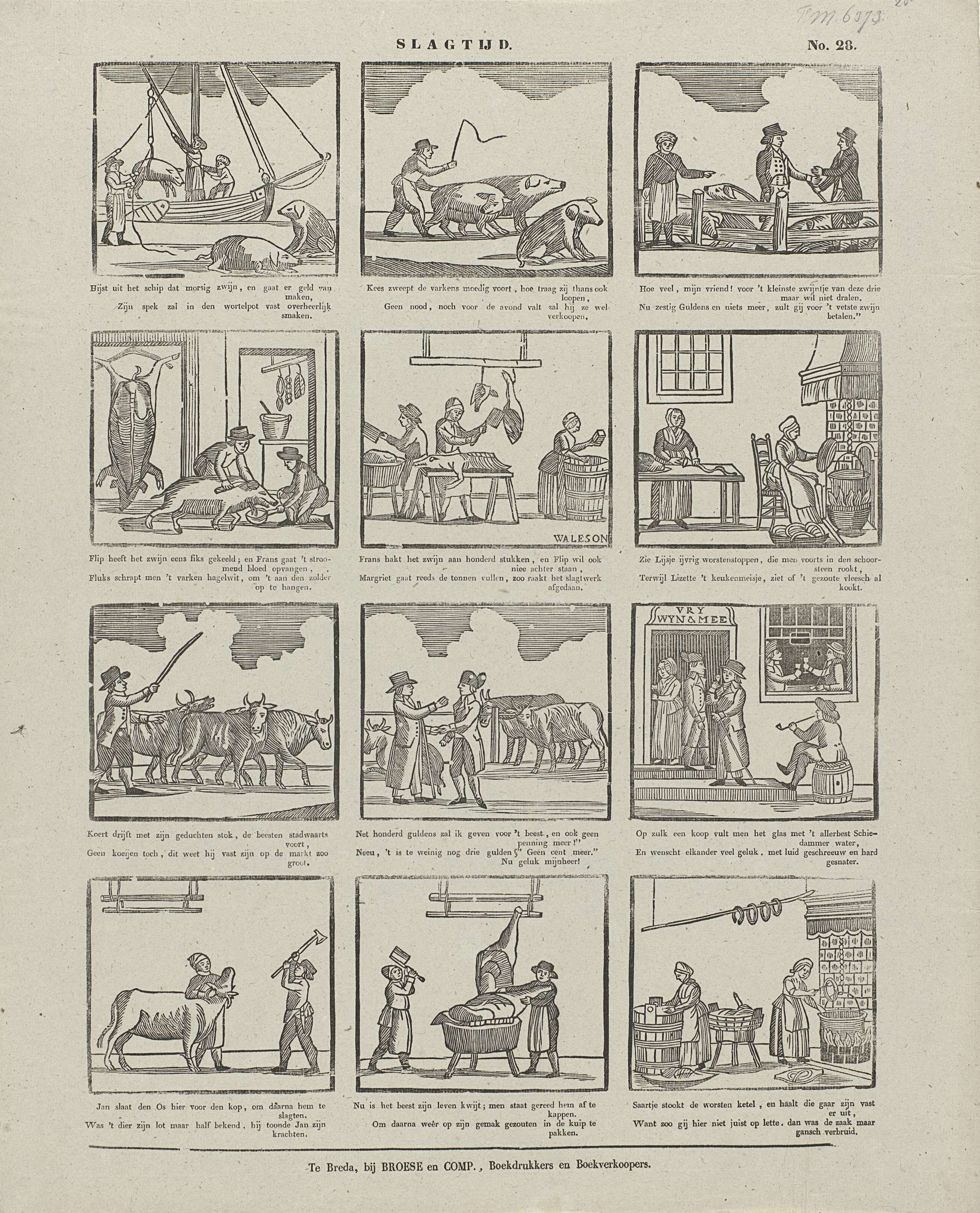 Blad met 12 voorstellingen van het fokken, slachten en bereiden van koeien en varkens. Onder elke afbeelding een vierregelig vers. Genummerd rechtsboven: No. 28.