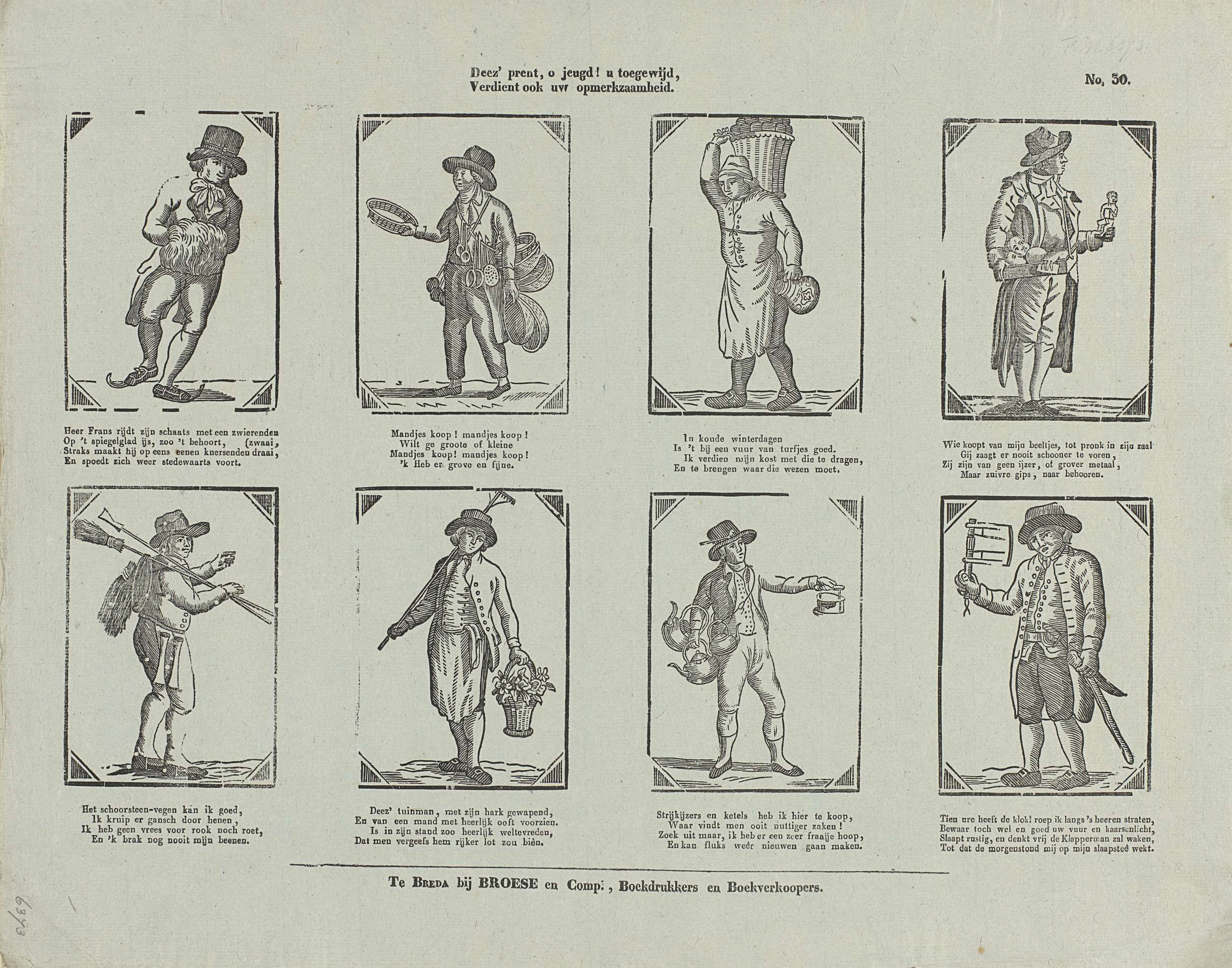 Blad met 8 voorstellingen van ambachtslieden en beroepen, zoals beeldenverkoper, mandenverkoper en tuinman. Onder elke afbeelding een vierregelig vers. Genummerd rechtsboven No. 30.