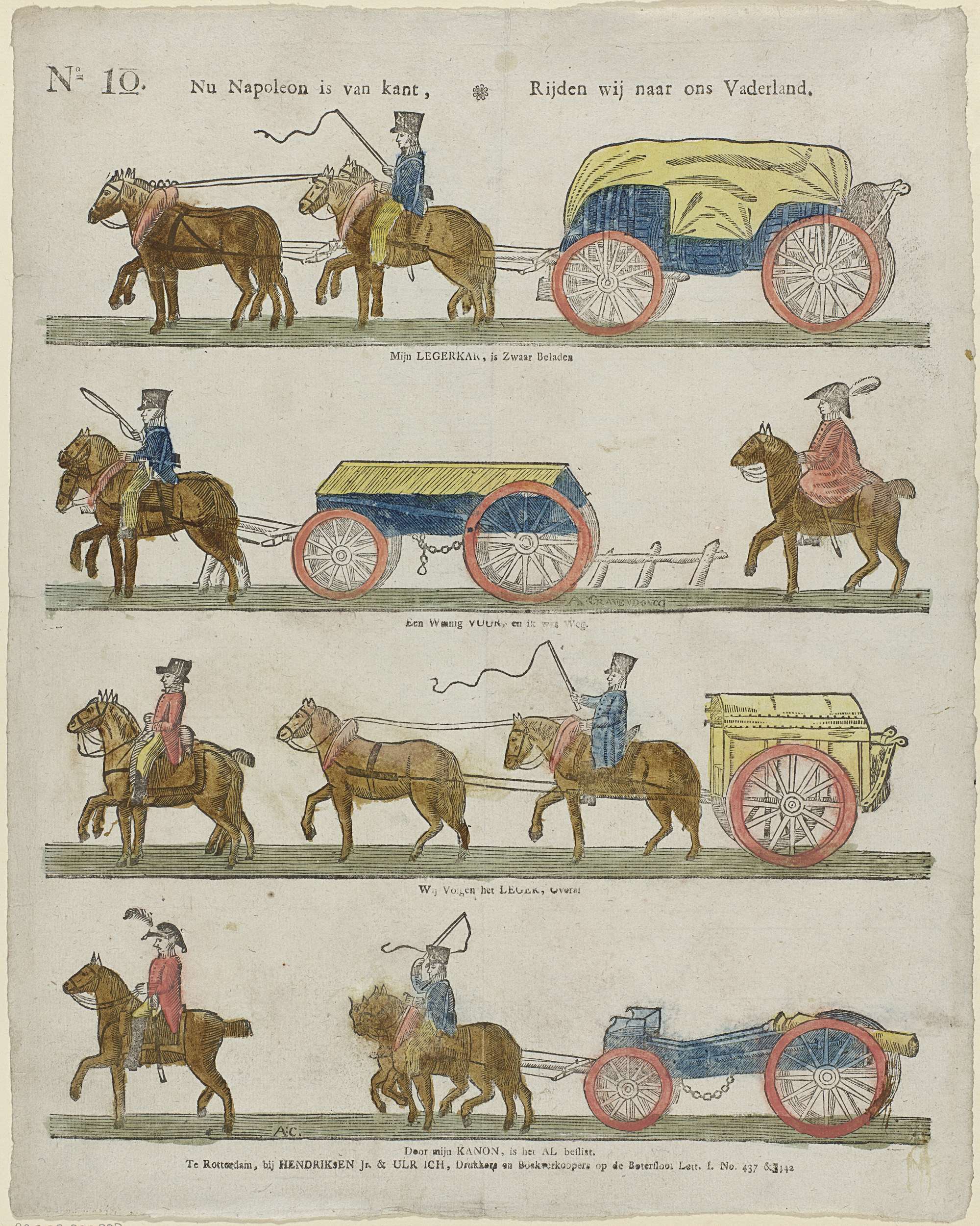 Blad met 4 horizontale rijen met voorstellingen van soldaten met paarden en wagens, op de terugweg naar hun vaderland na de Slag bij Waterloo. Onder elke afbeelding een onderschrift. Genummerd linksboven: No 10.