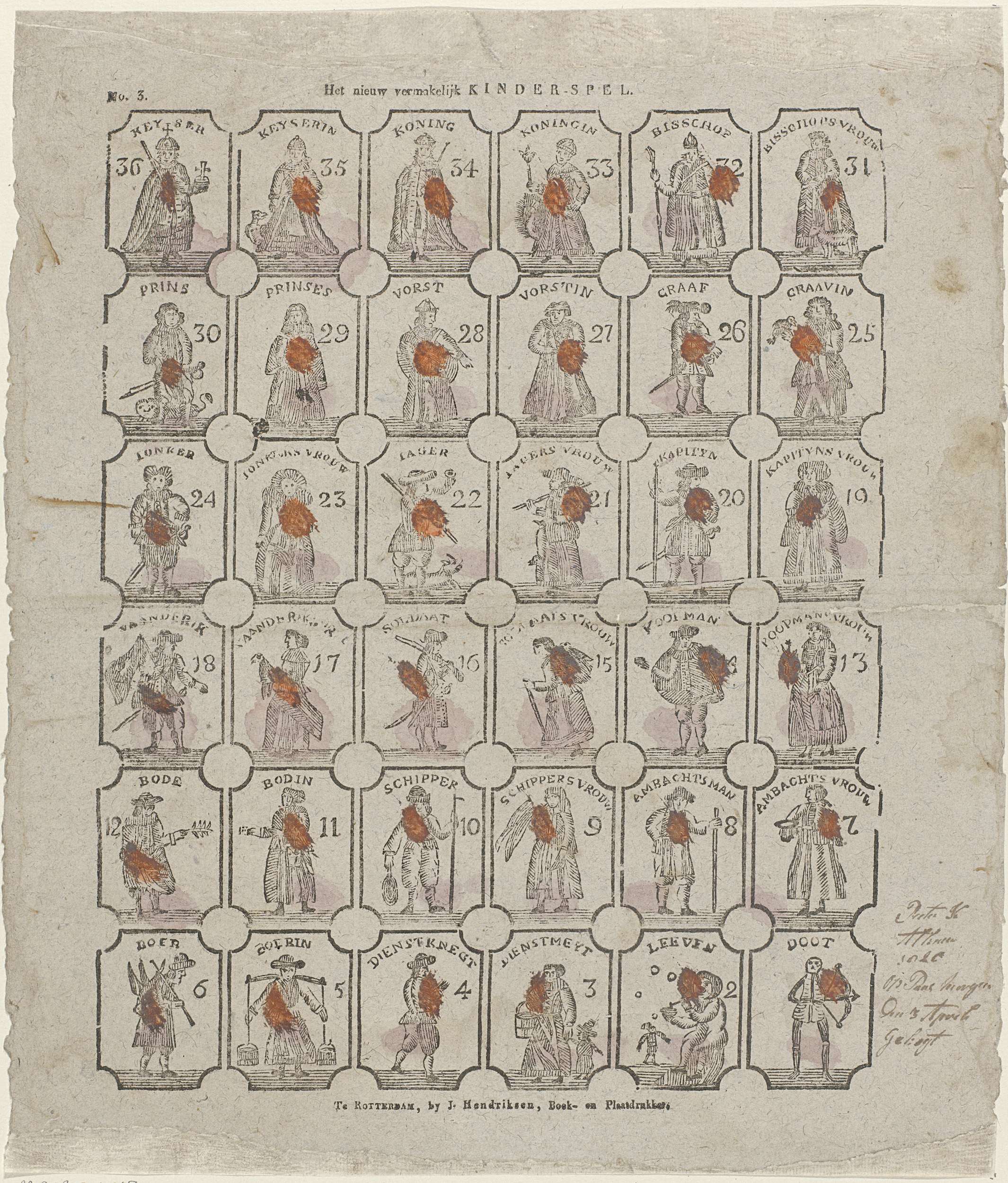 Blad met 36 speelkaarten (floskaartjes) met voorstellingen van verschillende figuren. De afbeeldingen vormen achttien paren, aflopend genummerd van bovenaan links nummer 36 tot onderaan rechts nummer 1. Op de twee laagste nummers na tonen ze zeventien koppels, man en vrouw, met de man net één nummer hoger dan de vrouw, waarbij elk paar een beroep ...