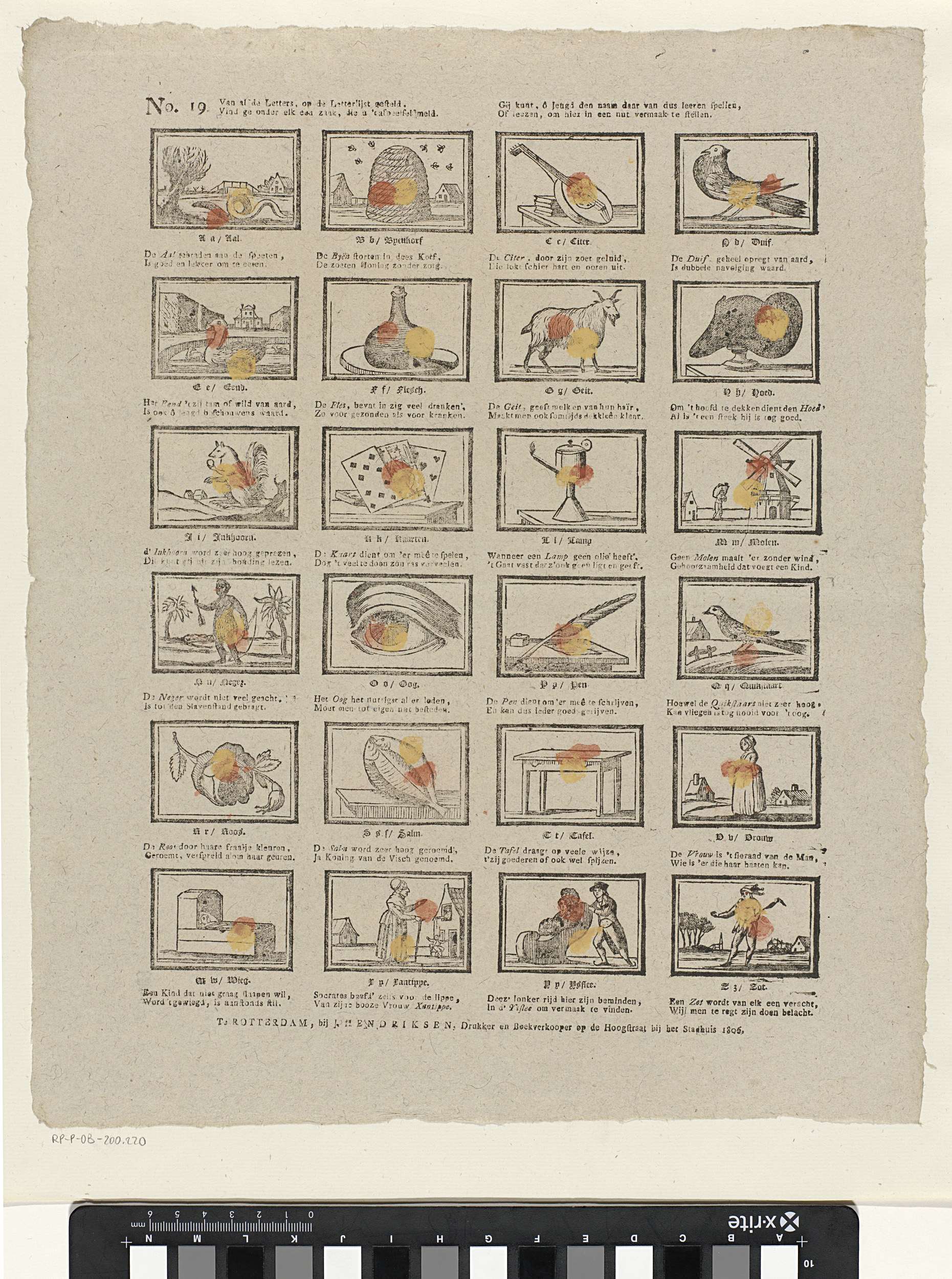 Blad met 24 voorstellingen van de letters van het alfabet geïllustreerd met voorwerpen, dieren en figuren waarvan de woorden met de betreffende letter beginnen. Onder elke afbeelding een onderschrift. Genummerd linksboven: No. 19.