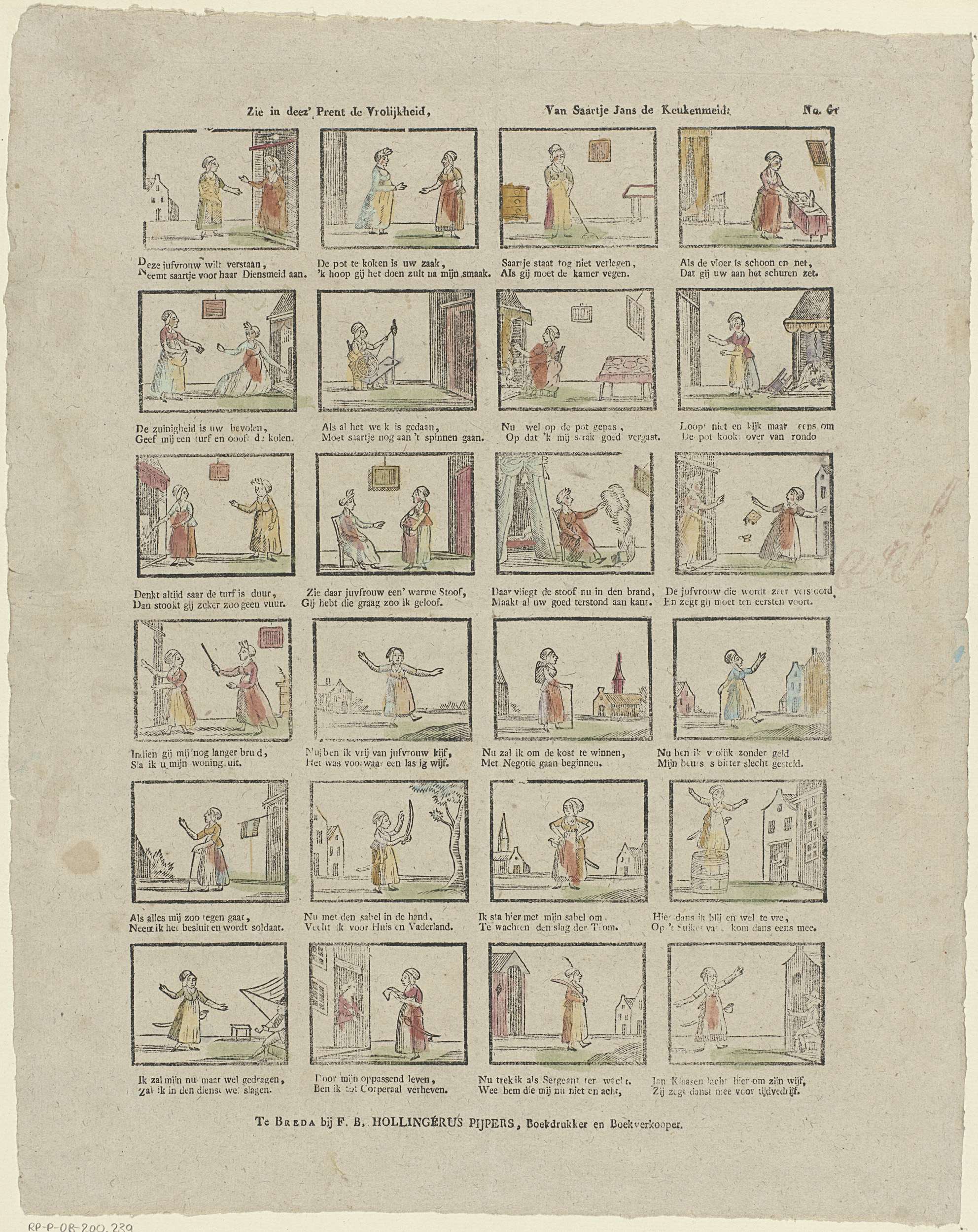 Blad met 24 voorstellingen uit het leven van Saartje Jans de keukenmeid. In de eerste scènes werkt zij als keukenmeid, maar wordt ontslagen omdat zij teveel van de dure turf gebruikt voor het koken. Daarna wordt zij soldaat. Onder elke afbeelding een tweeregelig vers. Genummerd rechtsboven: No. 61.