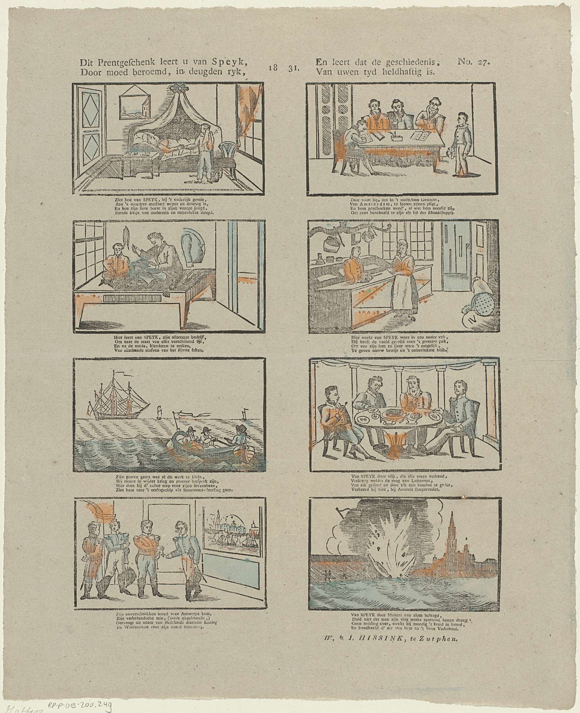 Blad met 8 voorstellingen over het leven en de zelfopoffering van J.C.J. van Speyk tijdens de strijd tegen de Belgen. Onder elke afbeelding een vierregelig vers. Genummerd rechtsboven: No. 27.