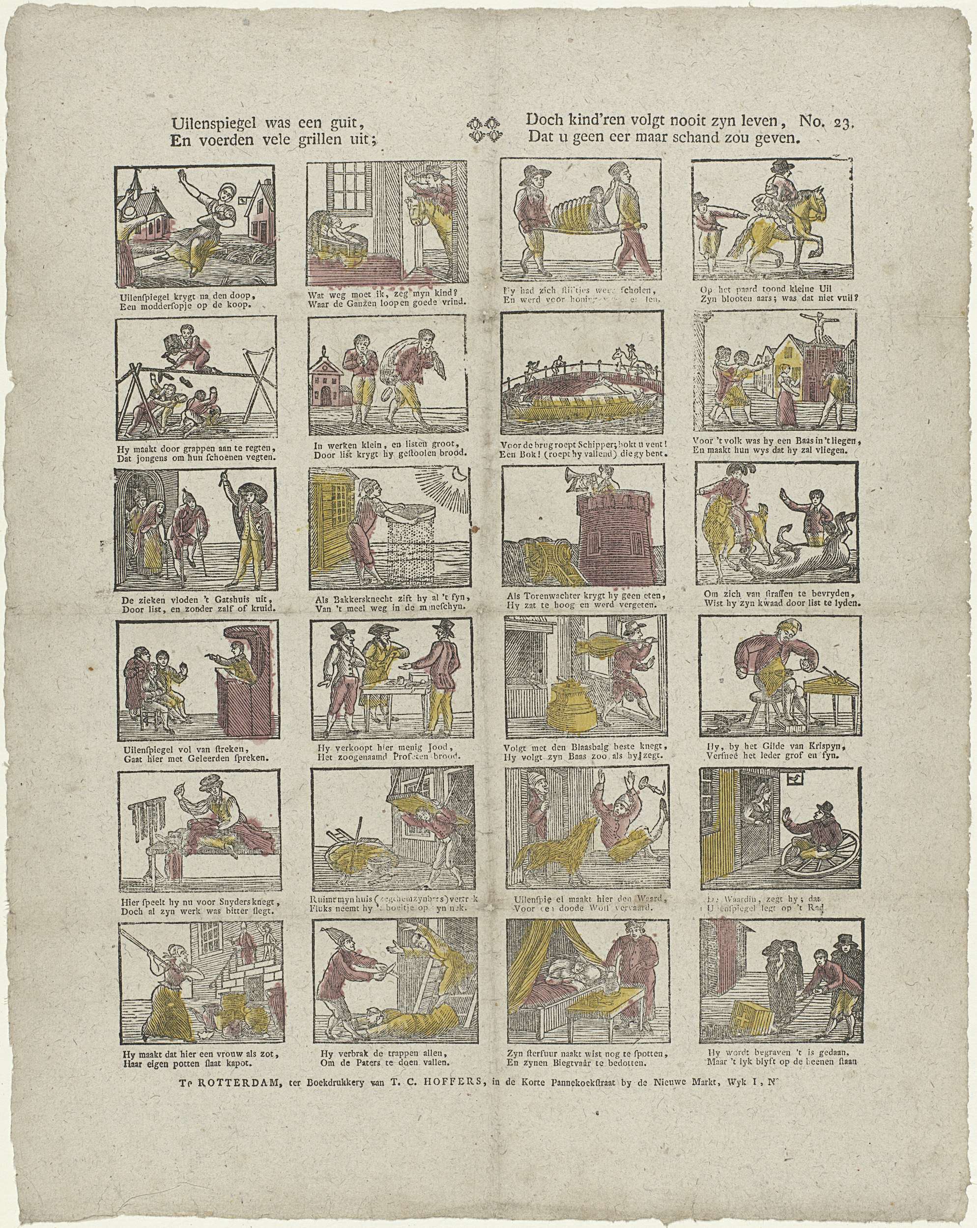 Blad met 24 voorstellingen over het leven van Tijl Uilenspiegel. Onder elke afbeelding een tweeregelig vers. Genummerd rechtsboven: No. 23.